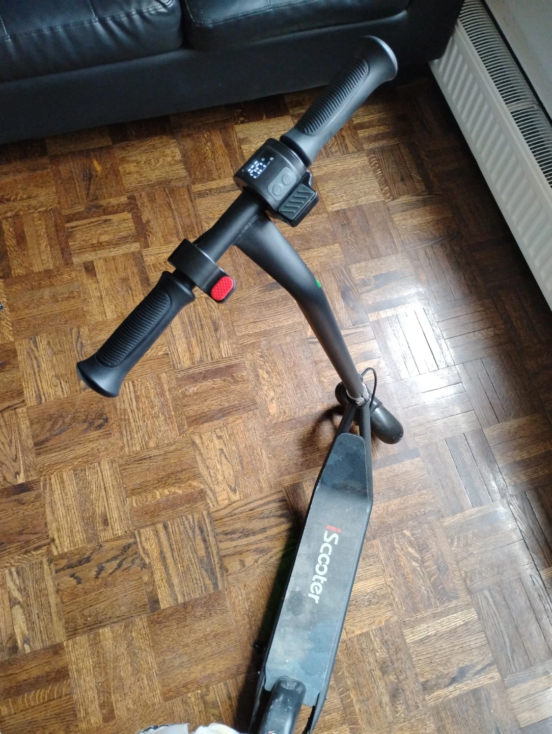 This black iScooter electric scooter is ready for your commute. It features a digital display on the handlebars and LED accent lights. This scooter is designed for urban travel. The e brake is not working only the normal brake is working. Negotiable