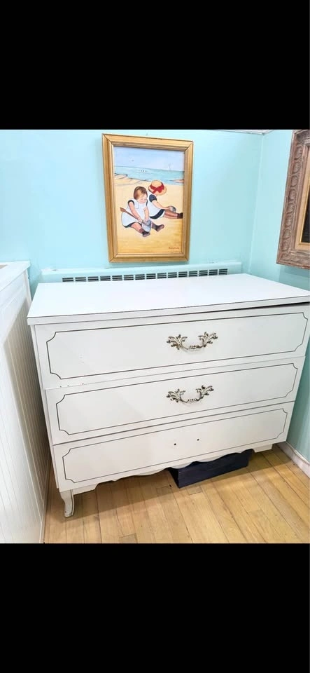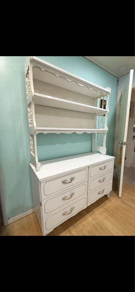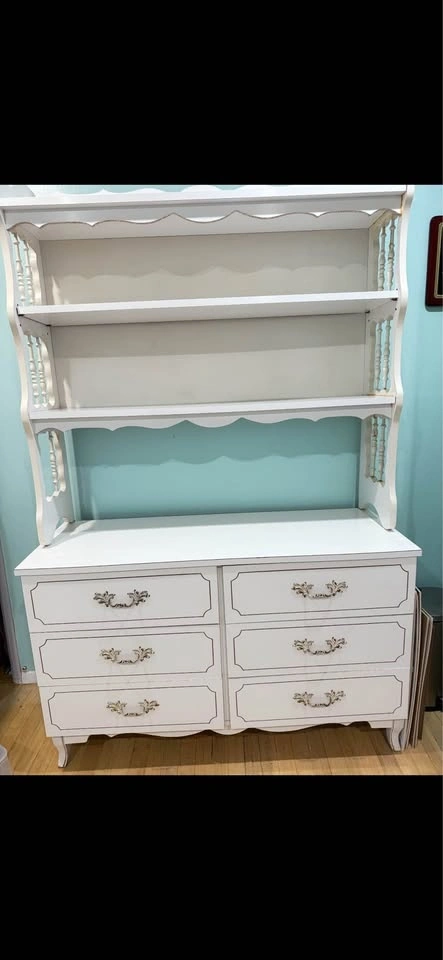 Sturdy, white Formica girls bedroom set including two dressers and a detachable hutch/bookshelf. Larger dresser measures 48" L x 18" D x 30" T. Detachable hutch measures 46" H x 11" W x 48" L. Smaller dresser measures 36" L x 18" W x 30" T. Features decorative brass handles.