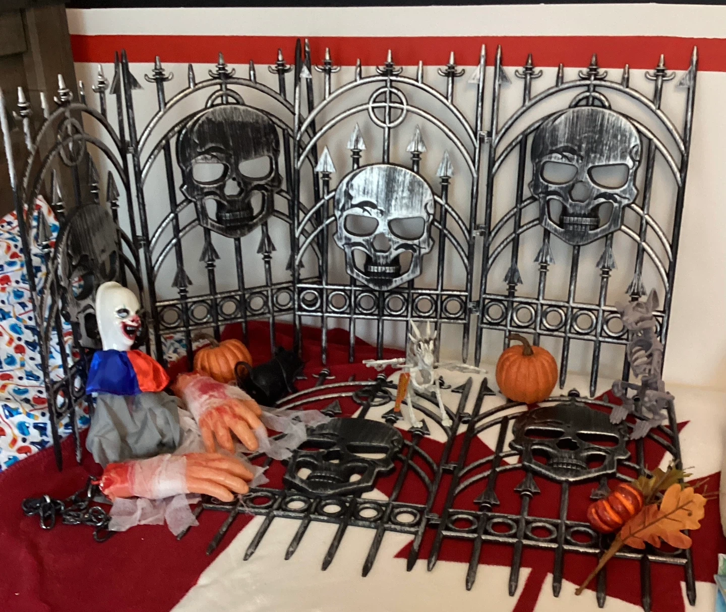 Selling a collection of Halloween decorations! Includes skull gates, pumpkins, skeleton figures, and other spooky props to create a creepy atmosphere for your Halloween party or haunted house