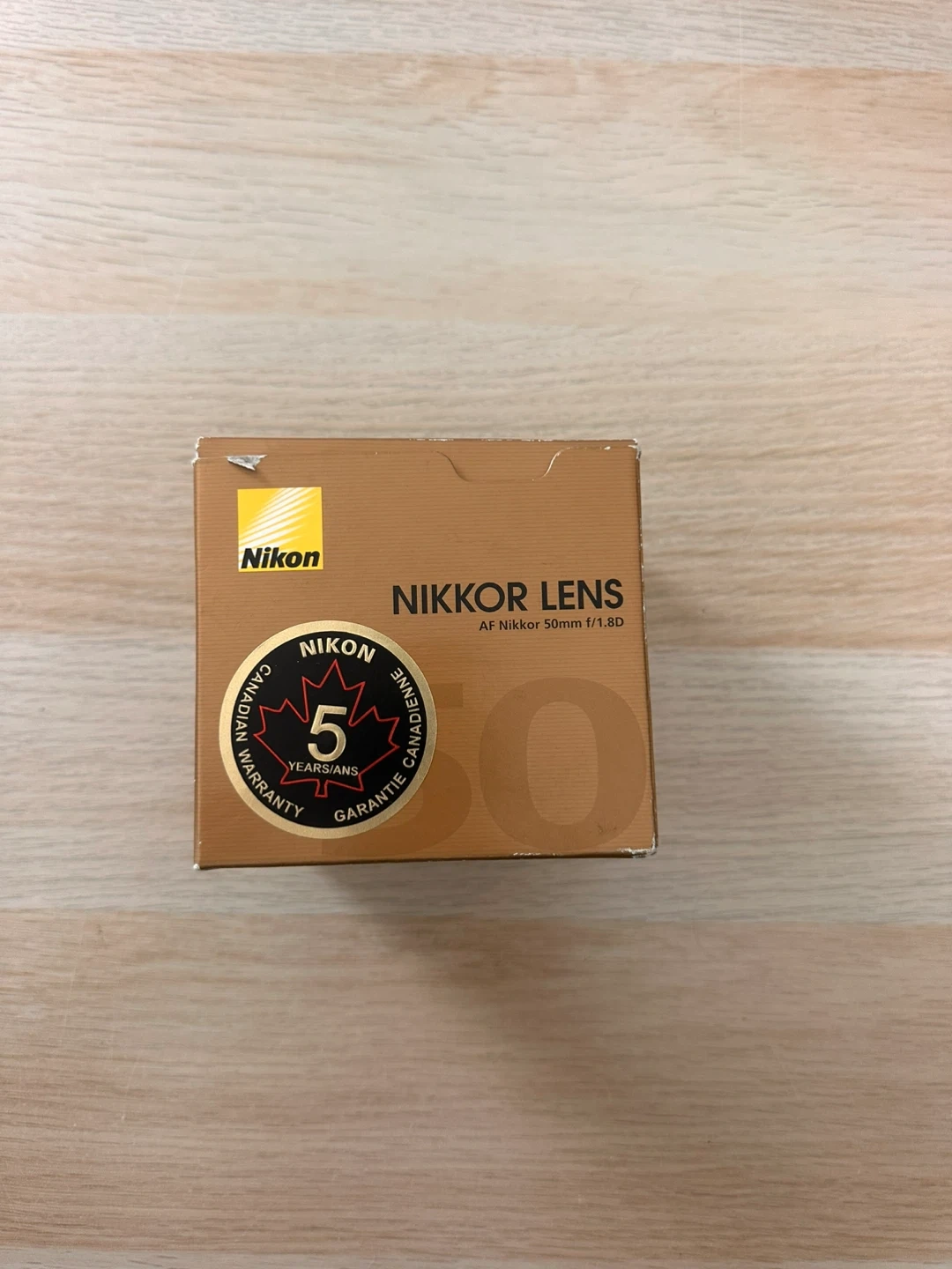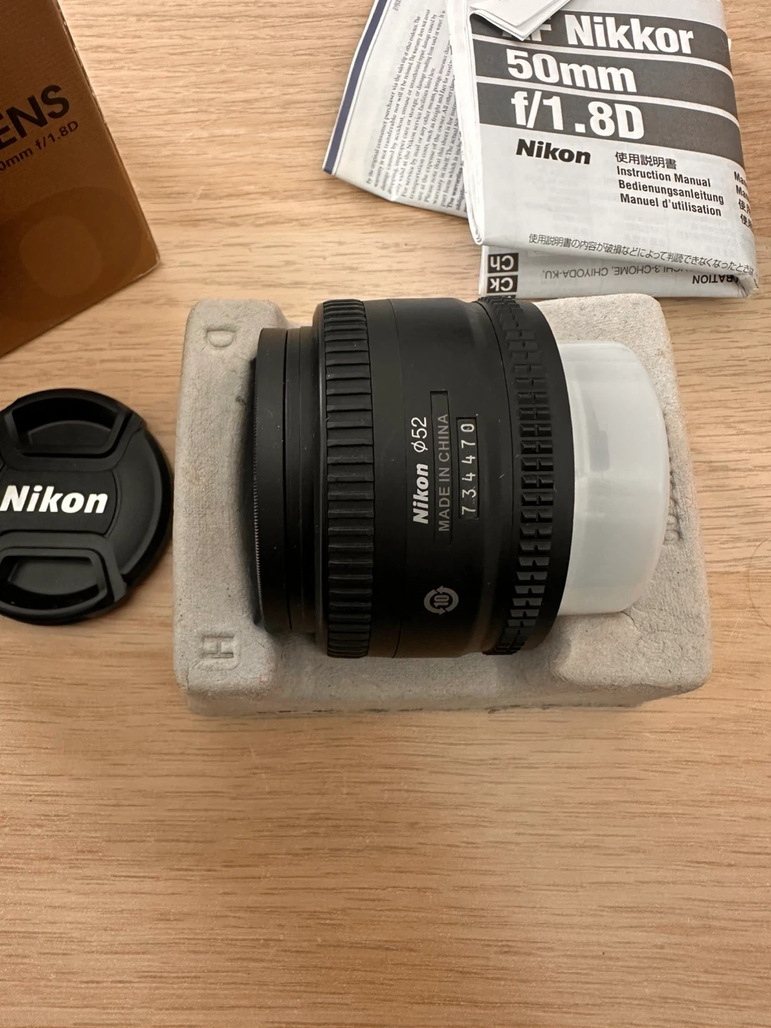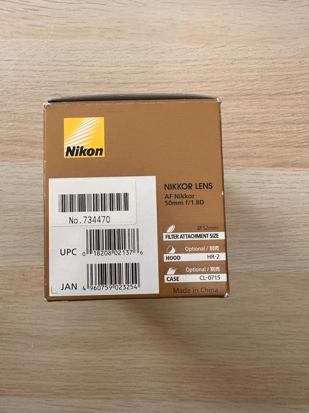 This is a Nikon AF Nikkor 50mm f/1.8D camera lens. It features a f/1.8 aperture for excellent low-light performance. The filter attachment size is 52mm. It's made in Japan and comes with its original box and lens cap.