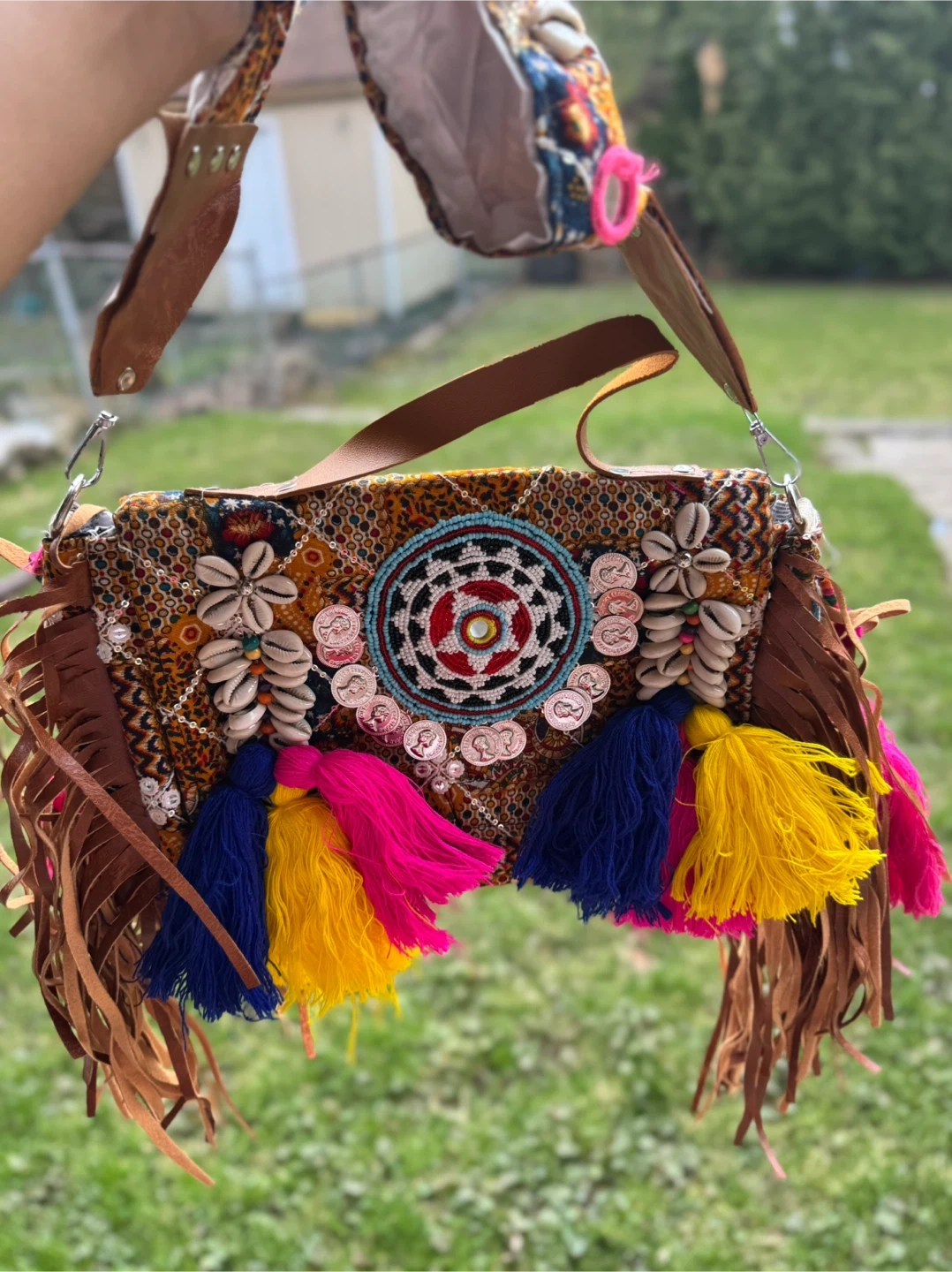 This unique boho-style bag features intricate embroidery, colourful tassels, and shell embellishments. It's made with a mix of fabric and leather accents. Great for adding a statement piece to any outfit!