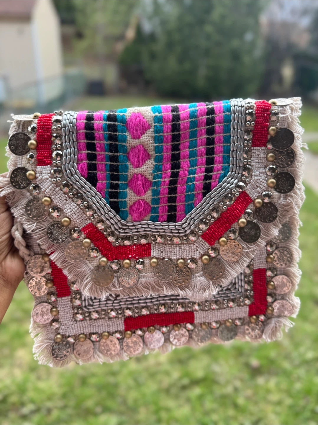Boho Embroidered Clutch/Crossbody Bag with Tassels & Shells