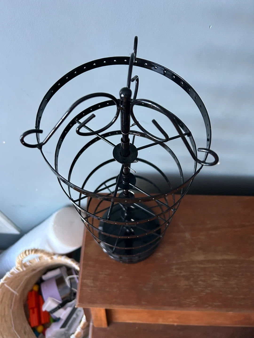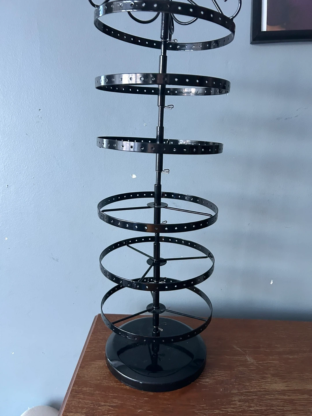 This black, 5-tier rotating jewelry organizer is perfect for displaying earrings. It's made of metal and offers plenty of space for your collection. Keeps your jewellery neatly organized and easily accessible! Originally $40, selling for $25