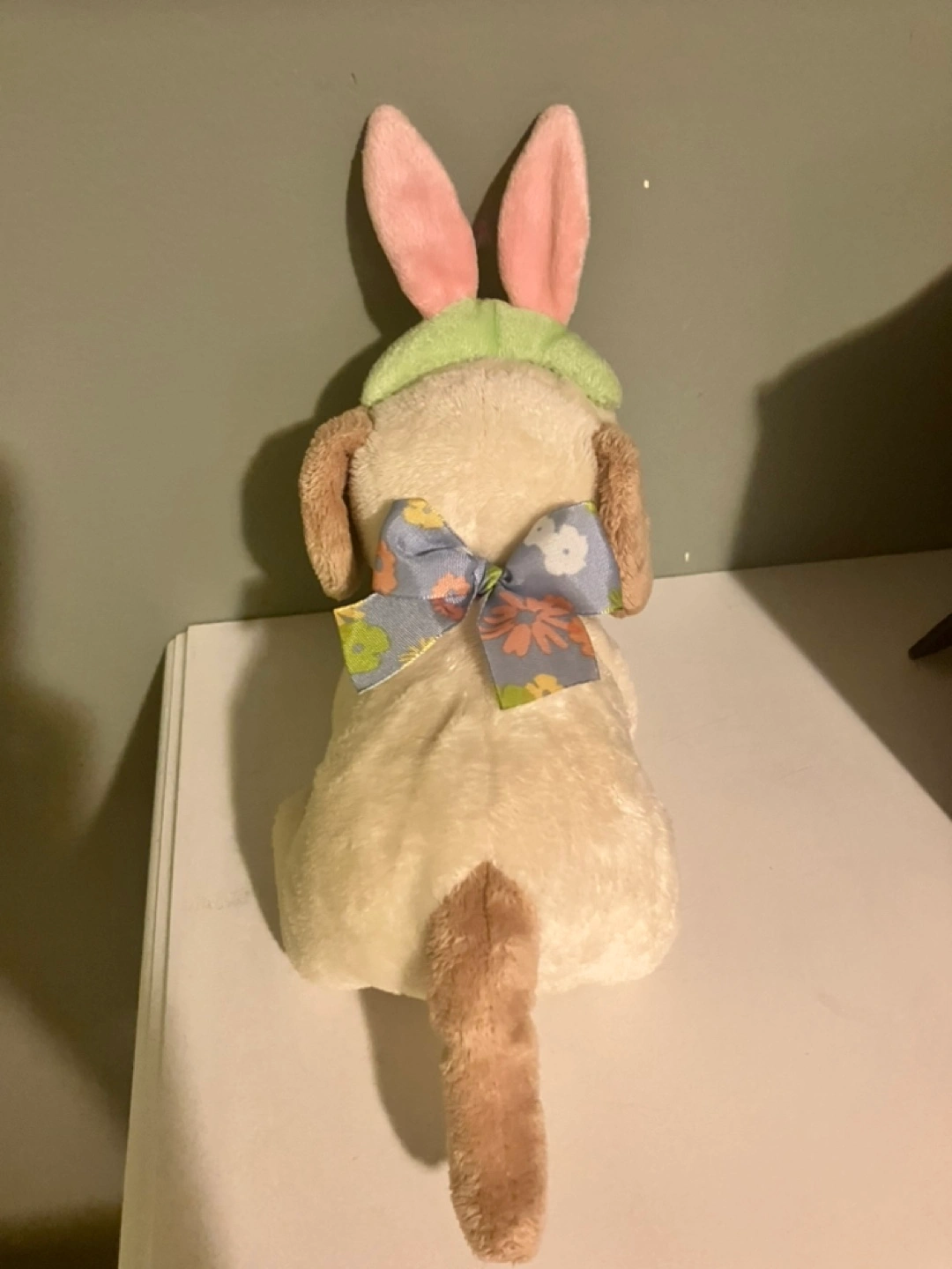 Cute plush puppy toy wearing a bunny hat. Perfect Easter gift or decoration. Soft and cuddly. Features pastel colours and floral accents.