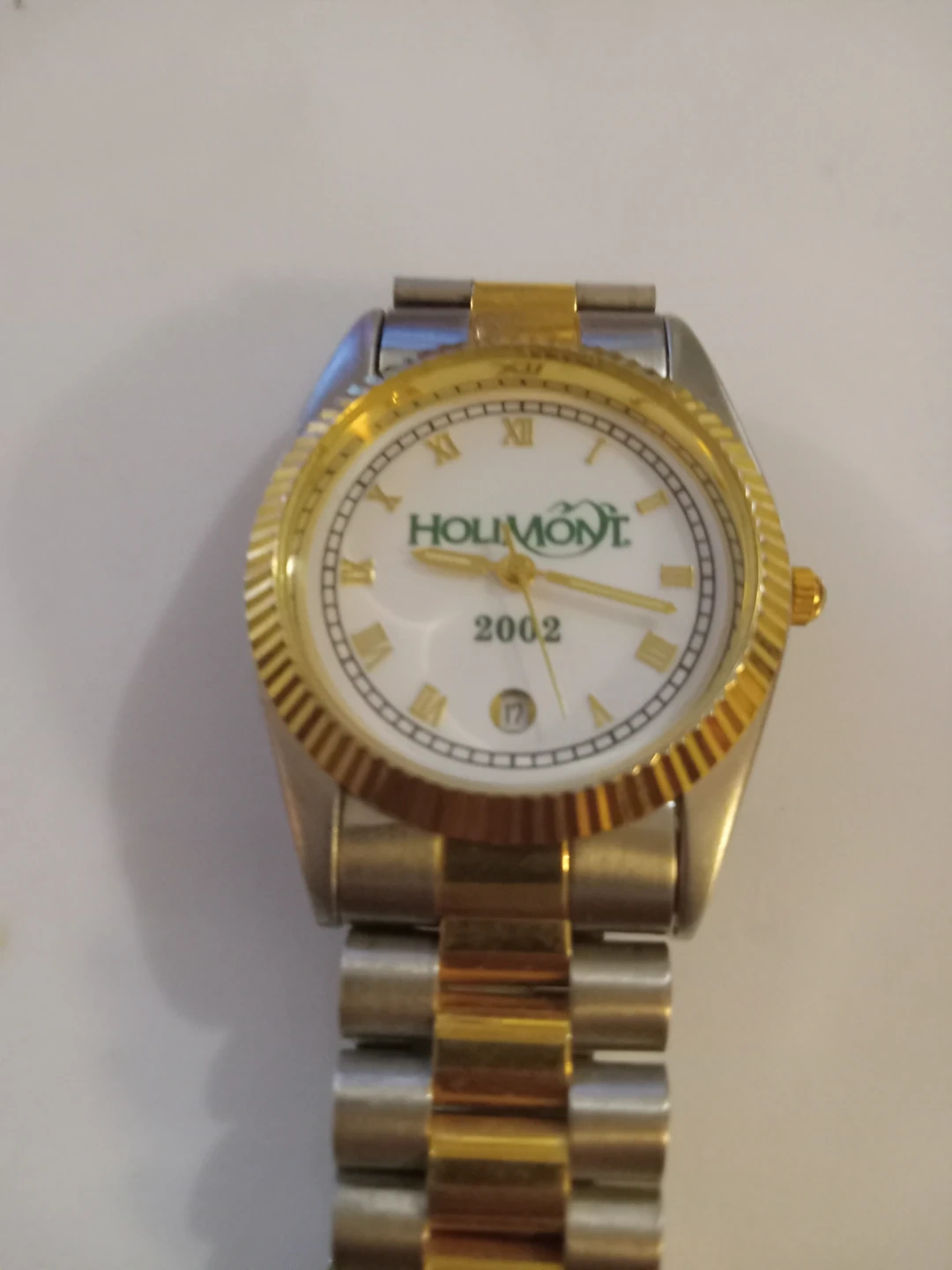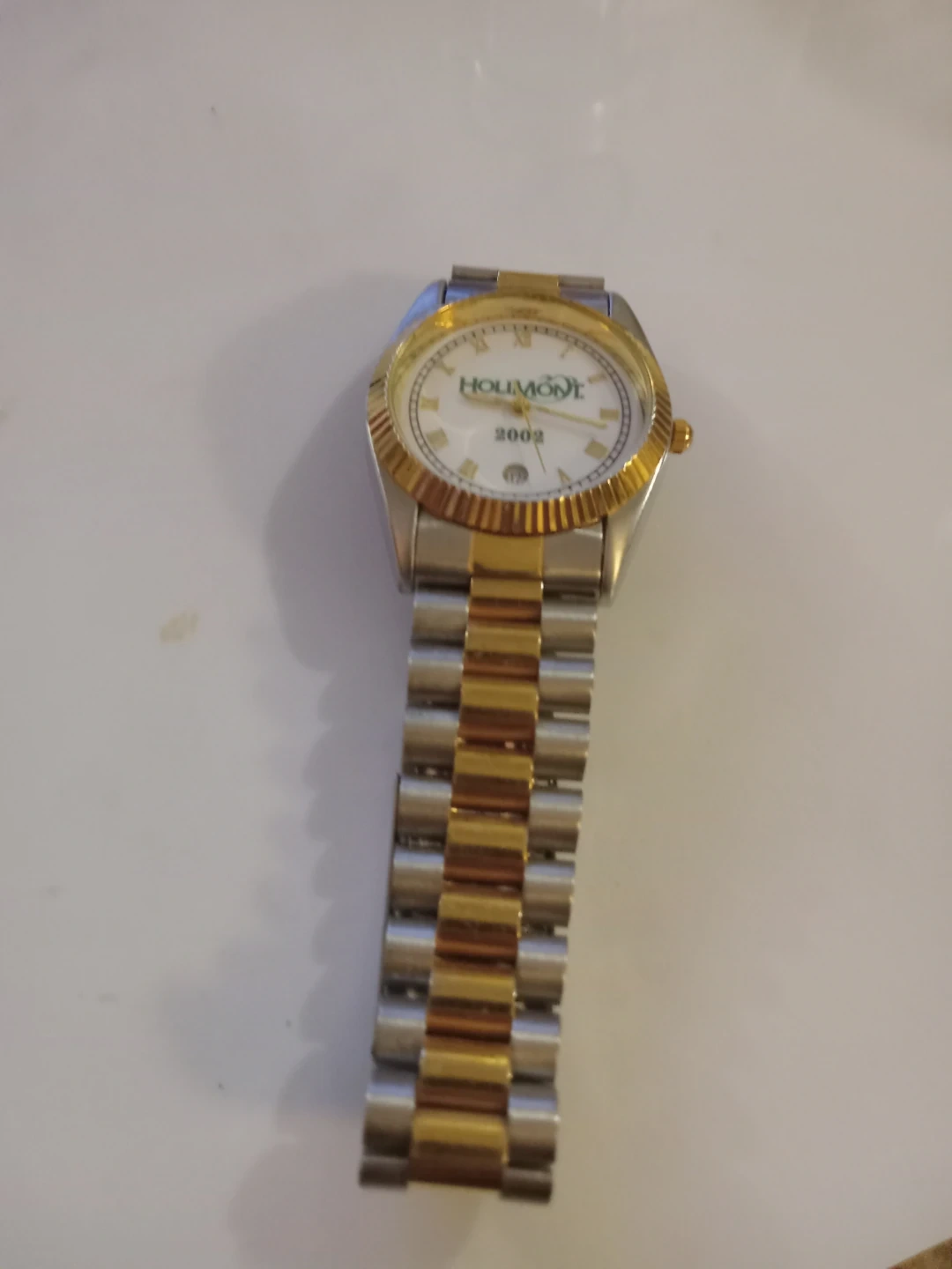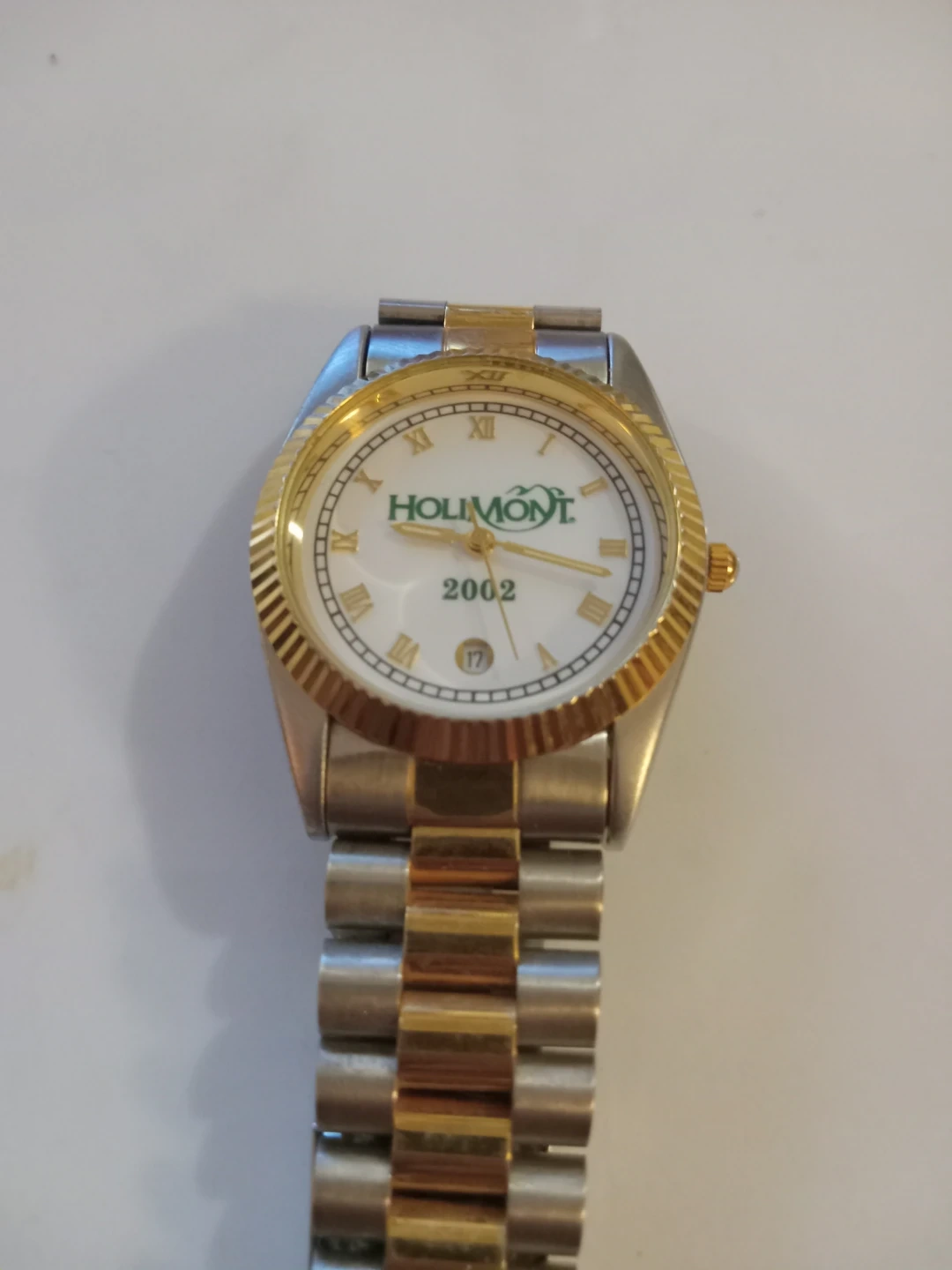 This is a Holimont watch with a white face and Roman numerals. It has a date display at the 6 o'clock position. The watchband is a two-tone silver and gold style. It's a nice accessory for any occasion!