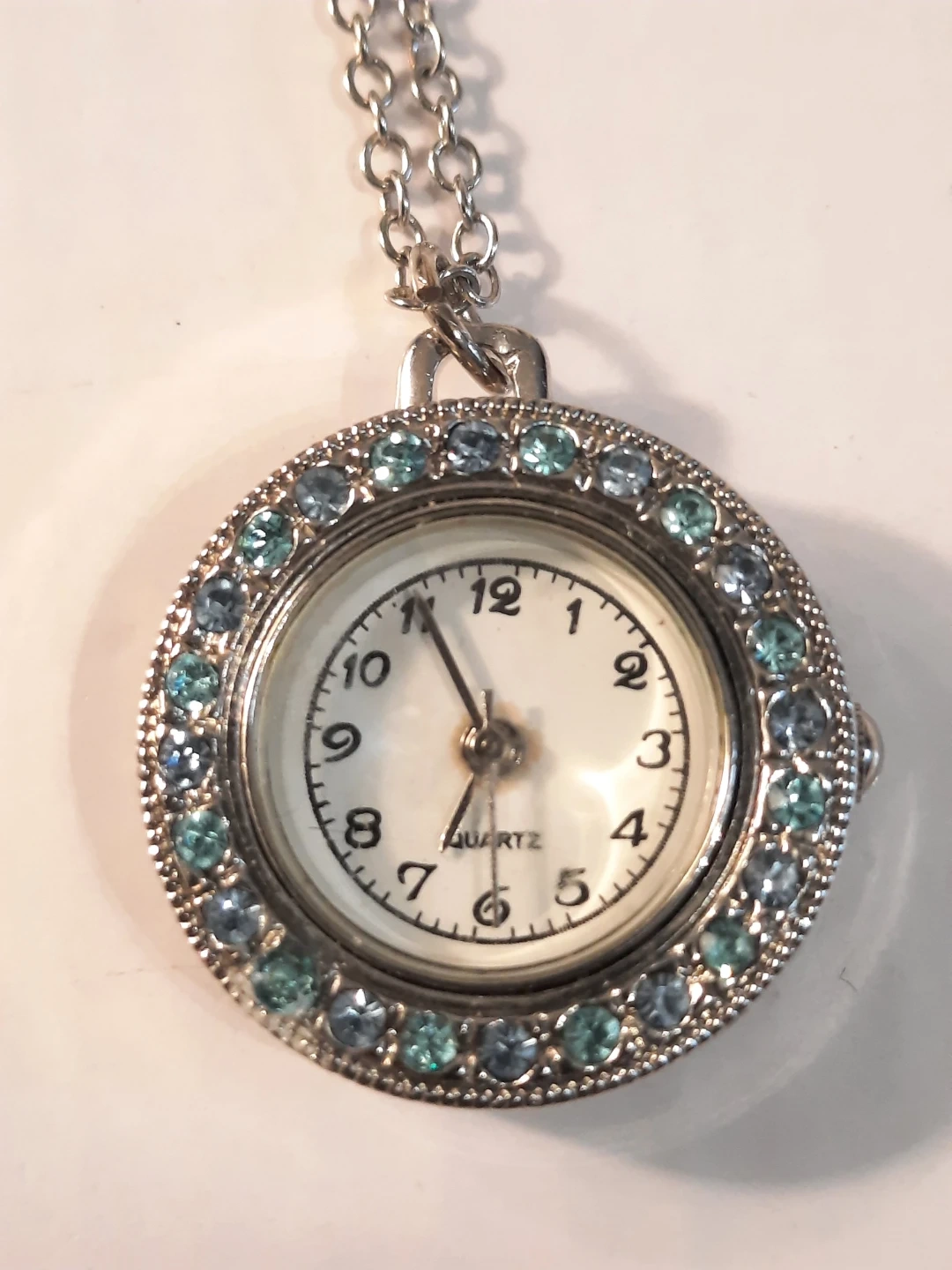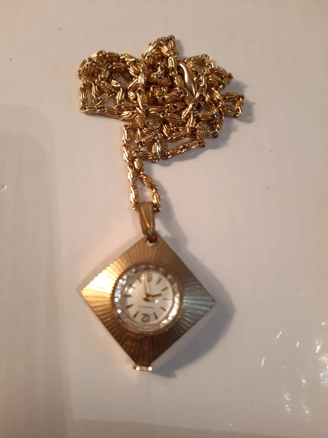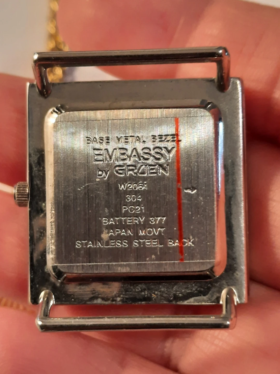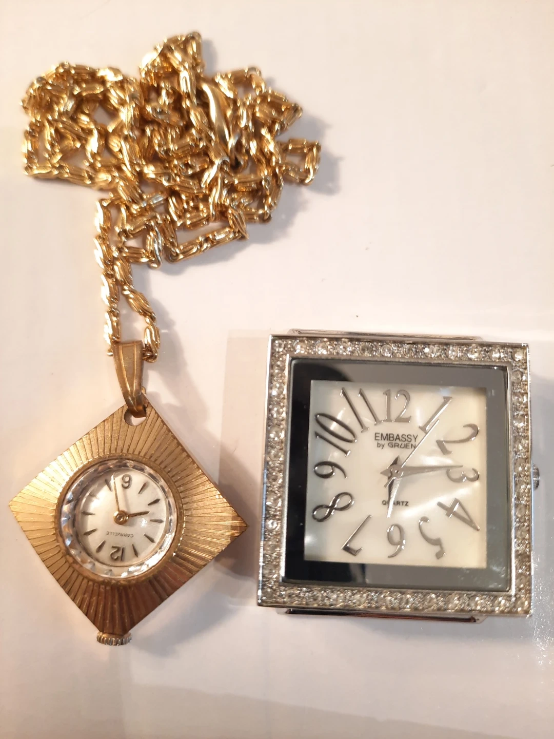 Lot of three watches Features an Embassy by Gruen square watch with crystal accents and a silver chain. Also includes a gold-tone Caravelle watch with a diamond-shaped face and a decorative round watch with blue and clear crystals and a silver chain. All are good condition. 2 need batteries one the Caravelle is mechanic.