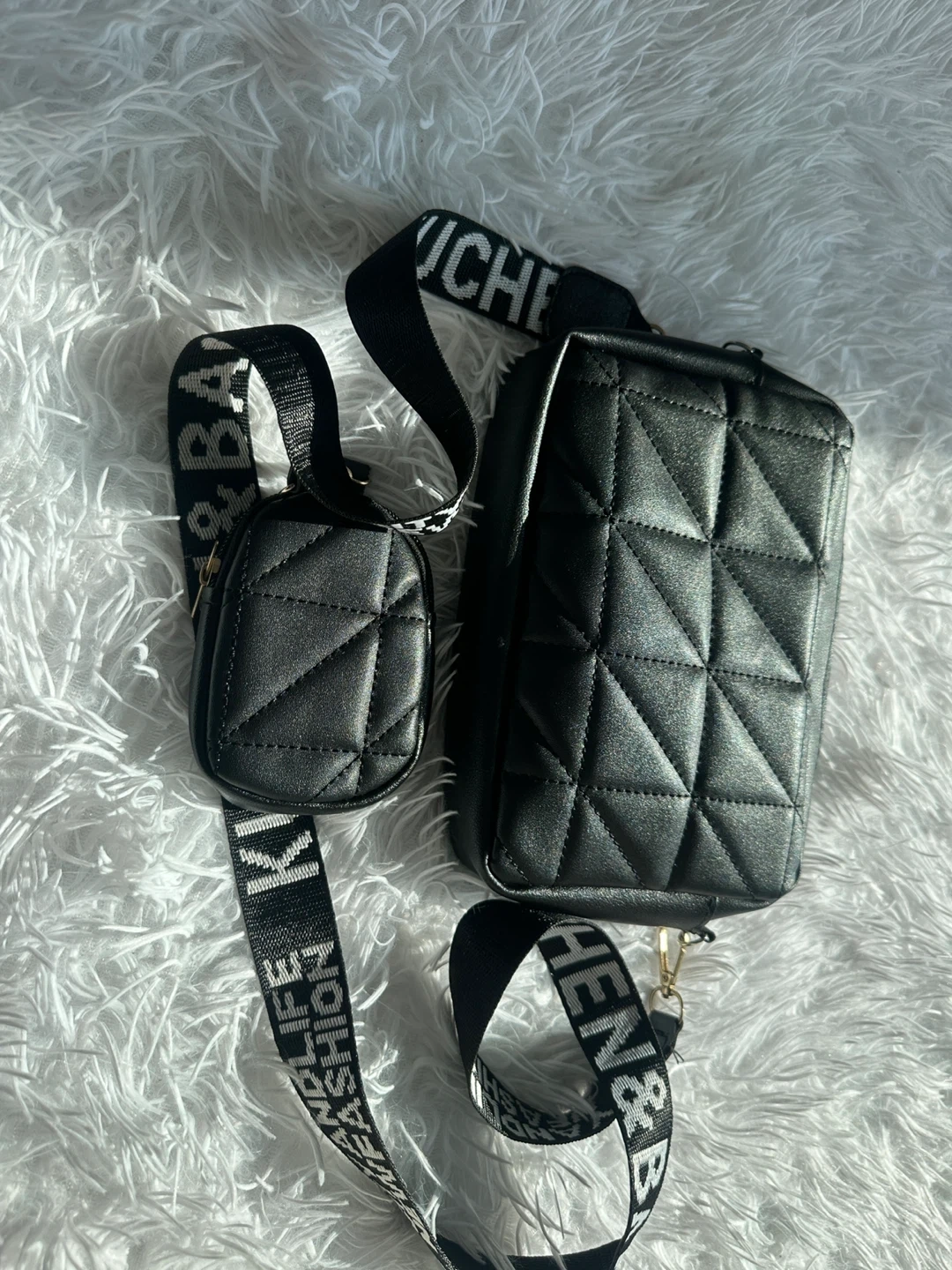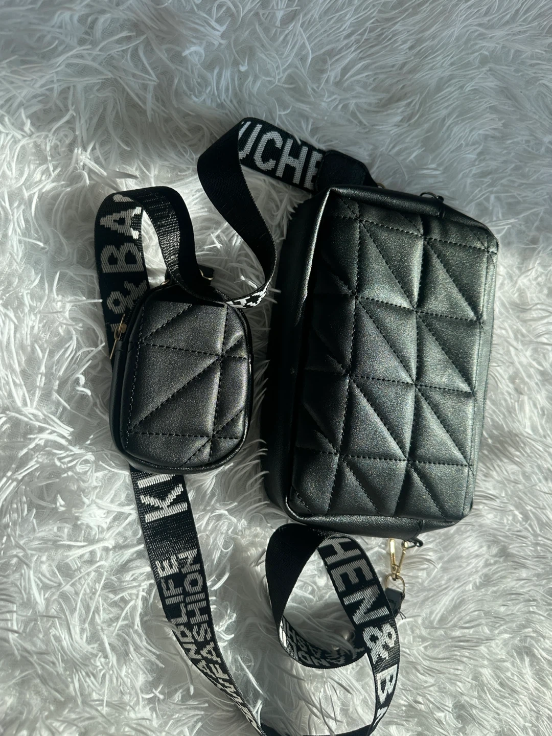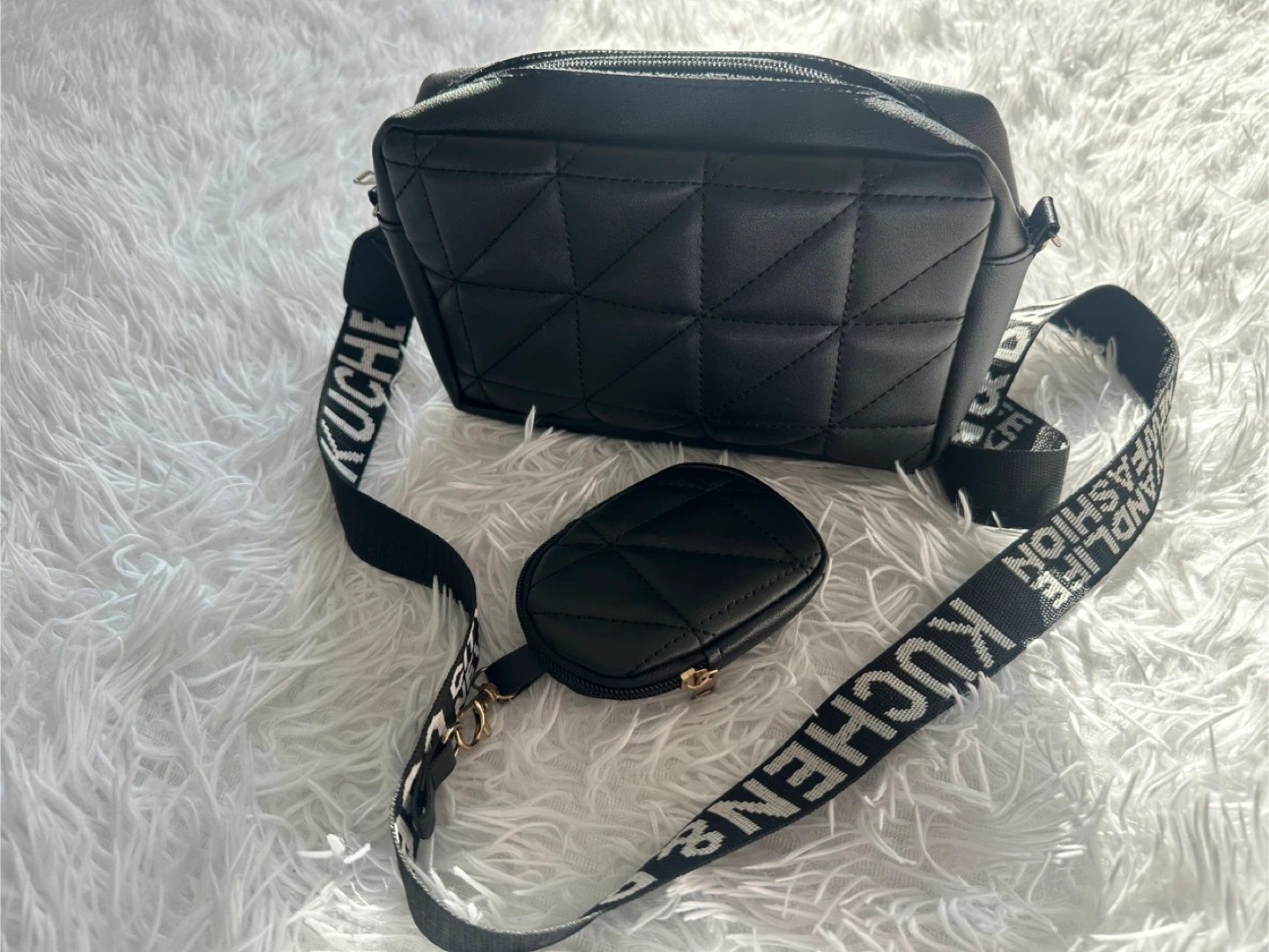 A stylish black crossbody bag with a quilted design. It comes with a matching coin pouch attached to the strap. The strap is adjustable and features repeating text.