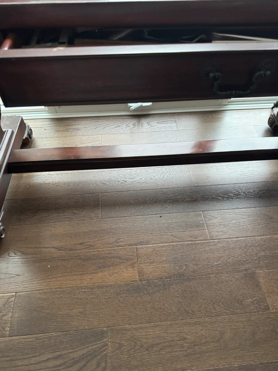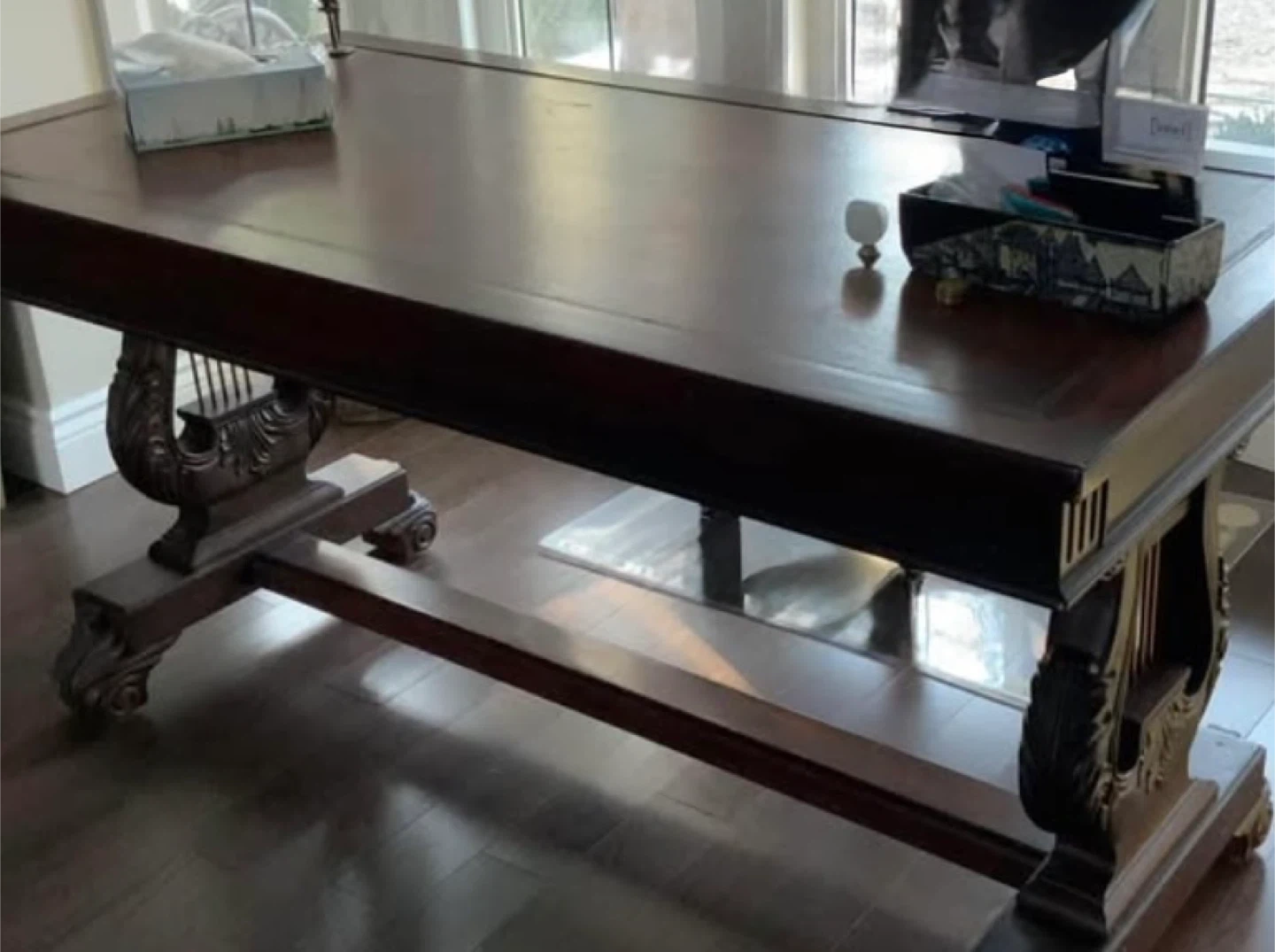 Dark walnut writing Table with Ornate Lyre Pedestals