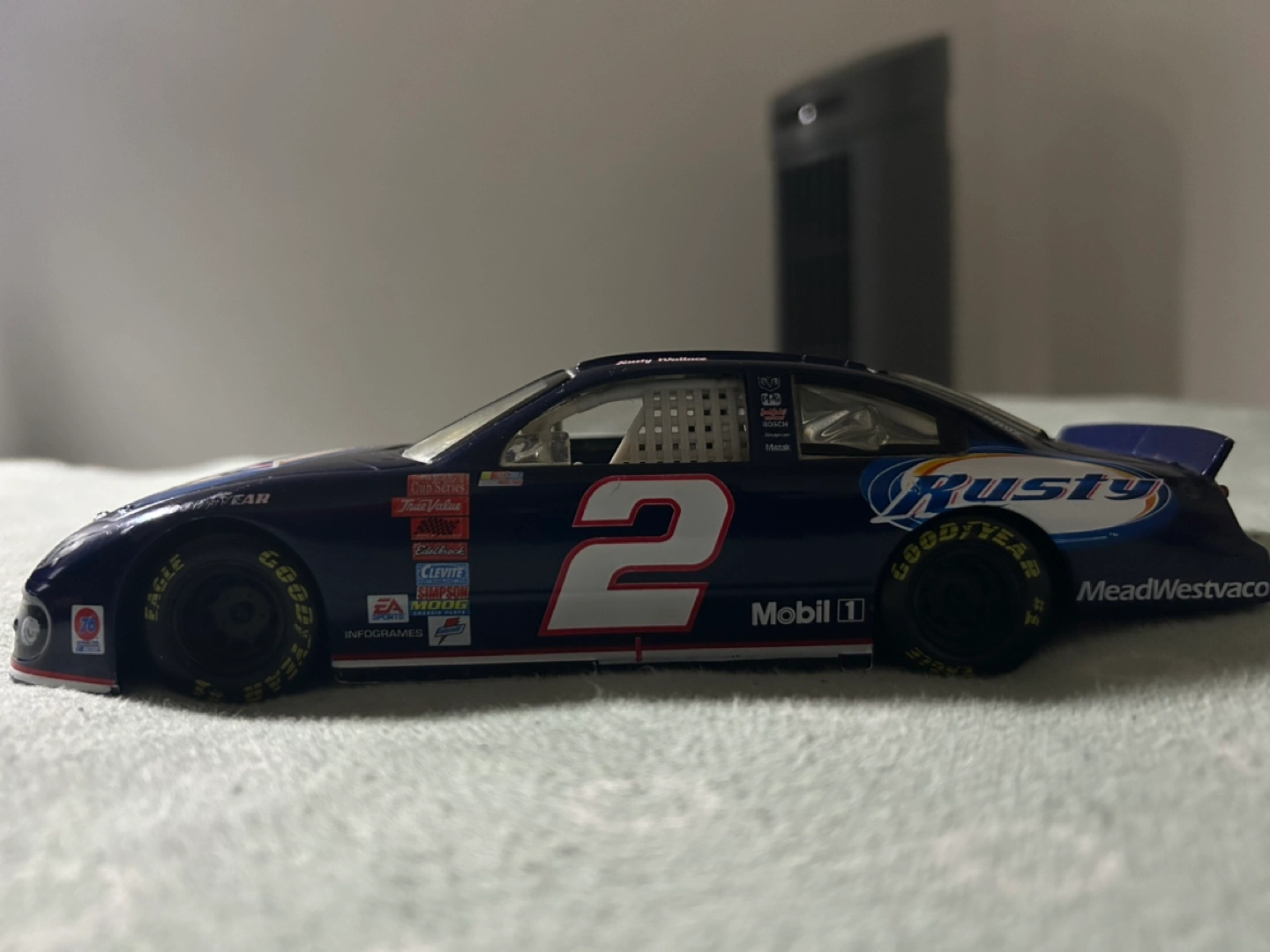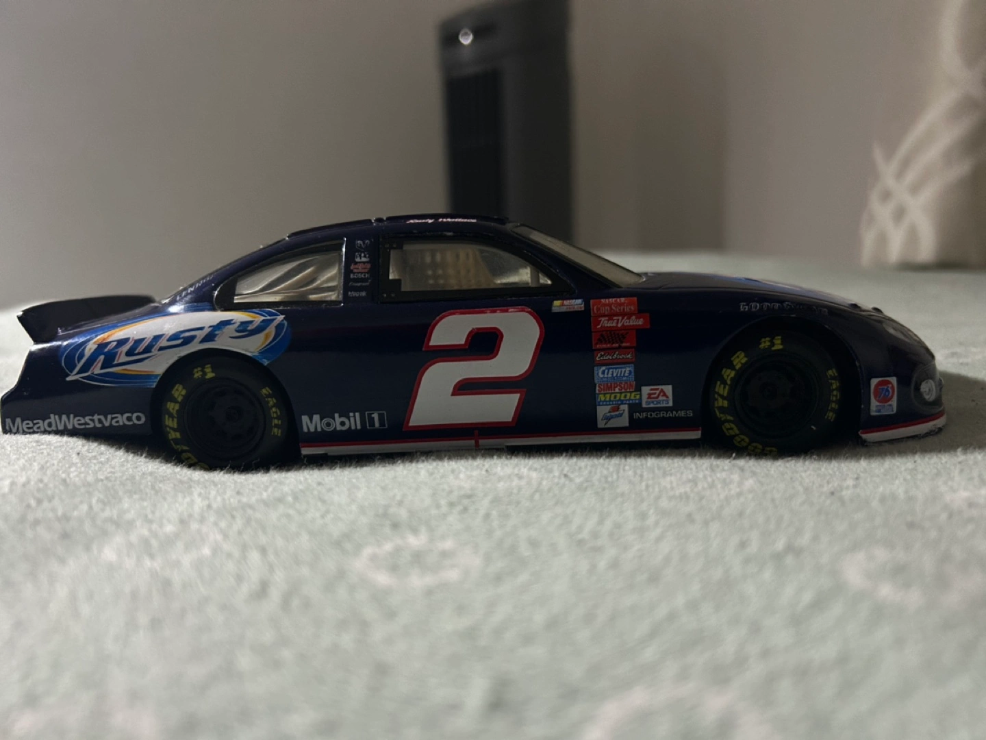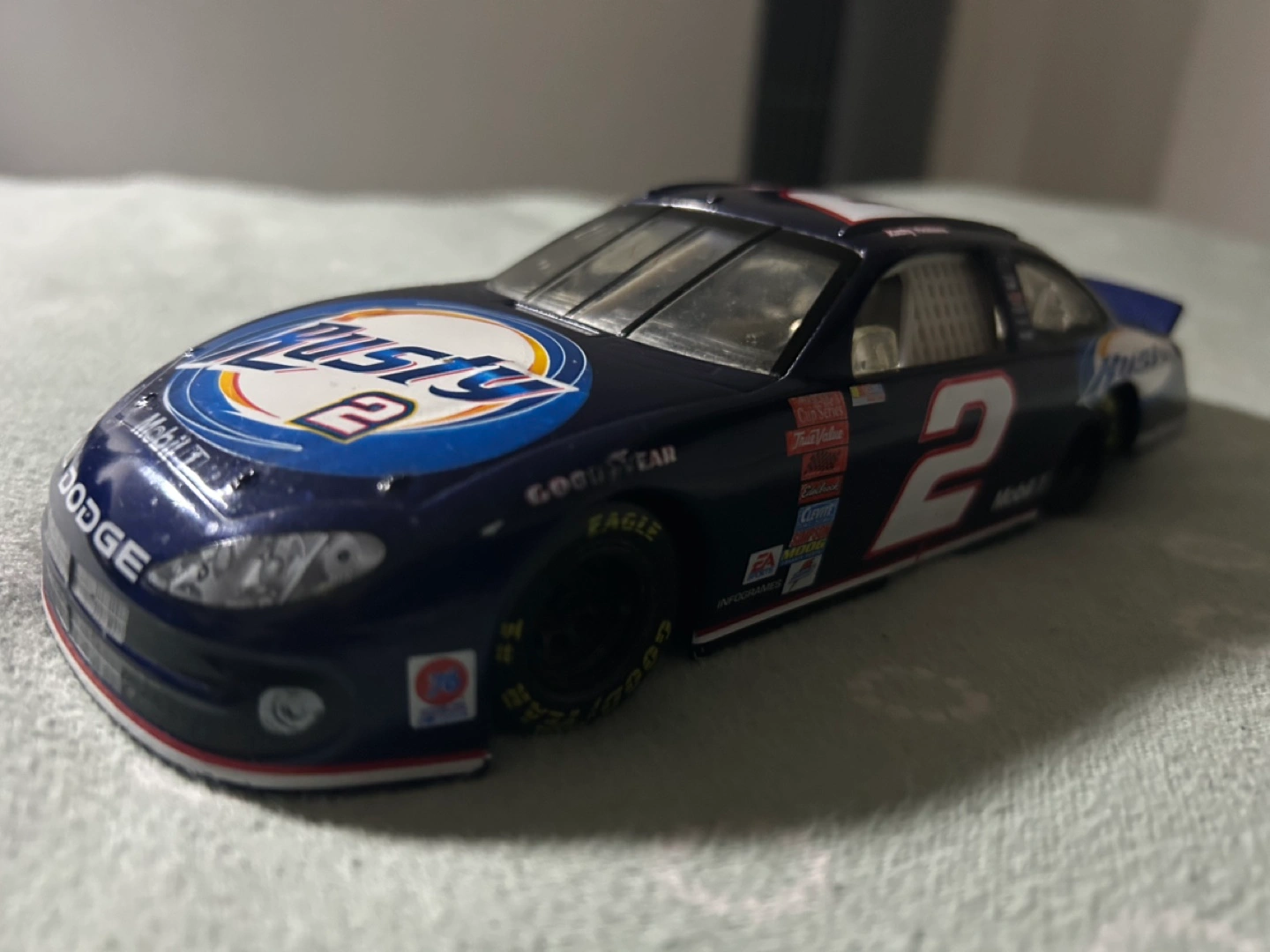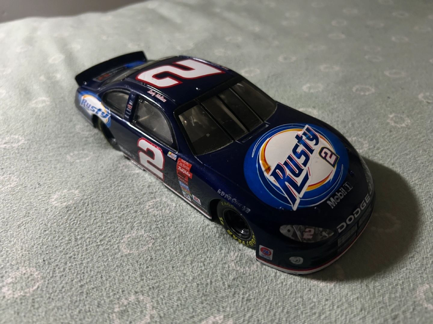 Collectible diecast of Rusty Wallace's #2 Dodge from the 2006 NASCAR season. Features various sponsors including Mobil 1, Goodyear, and MeadWestvaco. Great for collectors.