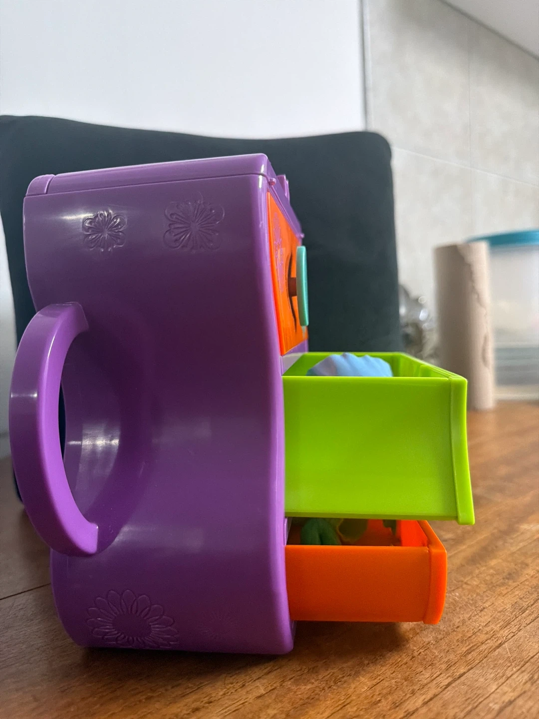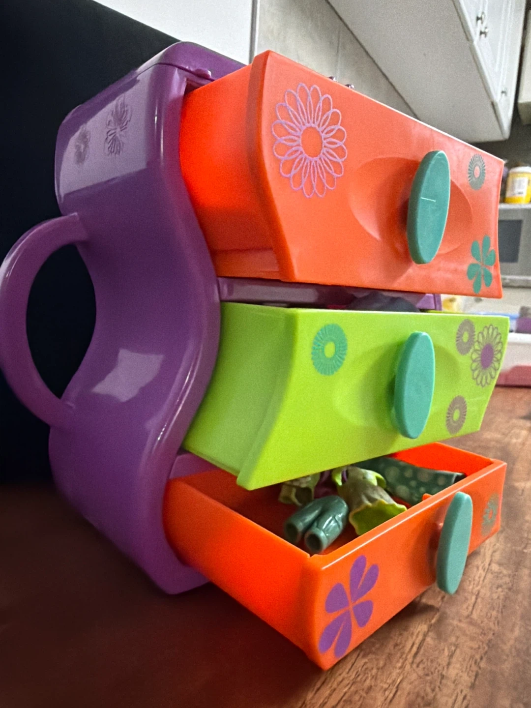 This is a fun, colourful 3-drawer mini chest from Polly Pocket. It's perfect for storing small trinkets or accessories. The drawers are orange and lime green with teal pulls. It's purple on the outside and features a graphic of a girl on one side.
