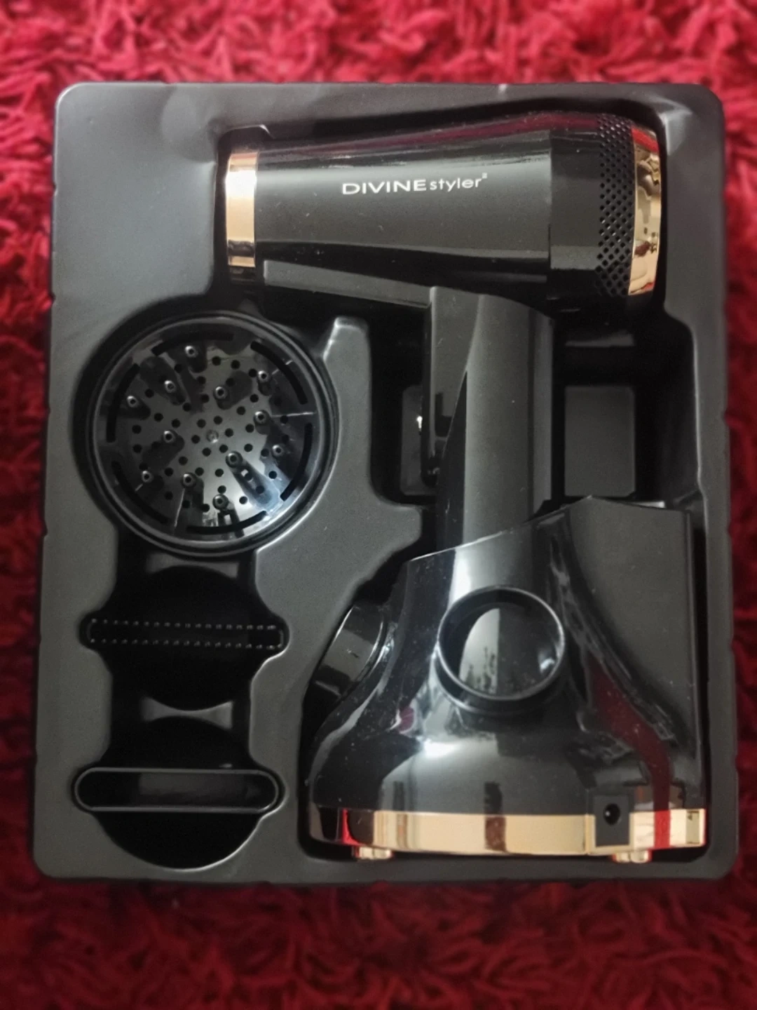 This is the DIVINE styler PRO cordless rechargeable hair dryer. It's black with gold accents and comes with a charge and go base and multiple styling accessories including a concentrator and diffuser. This dryer is great for travel or on-the-go touch-ups!