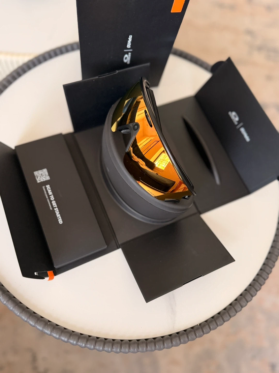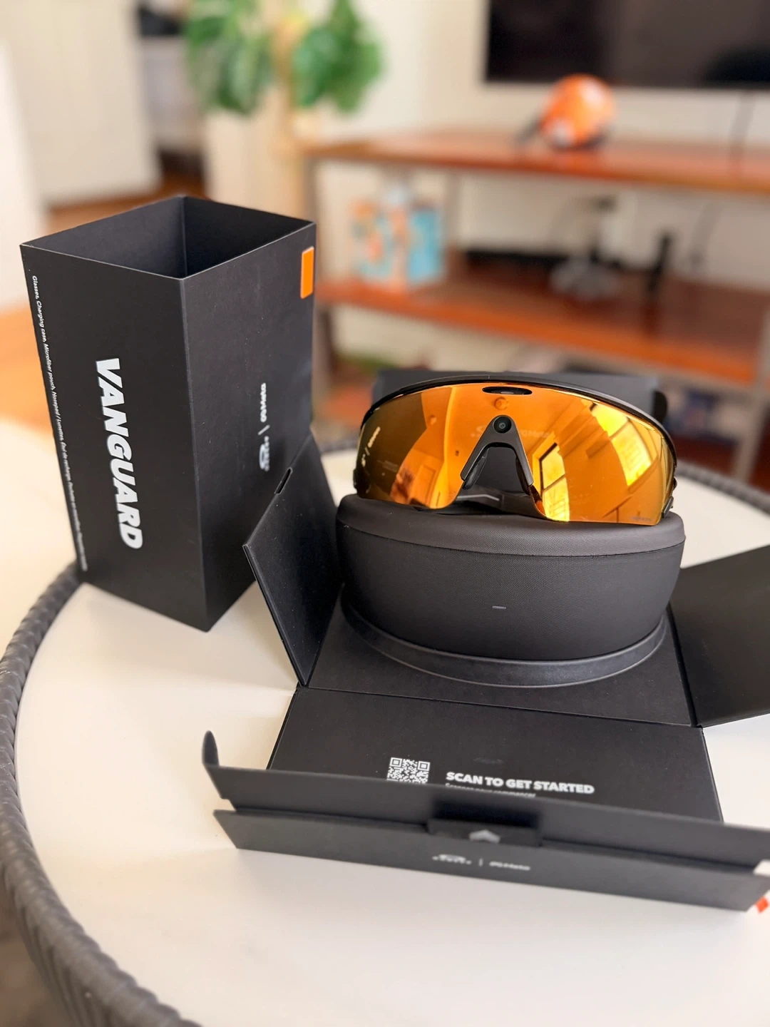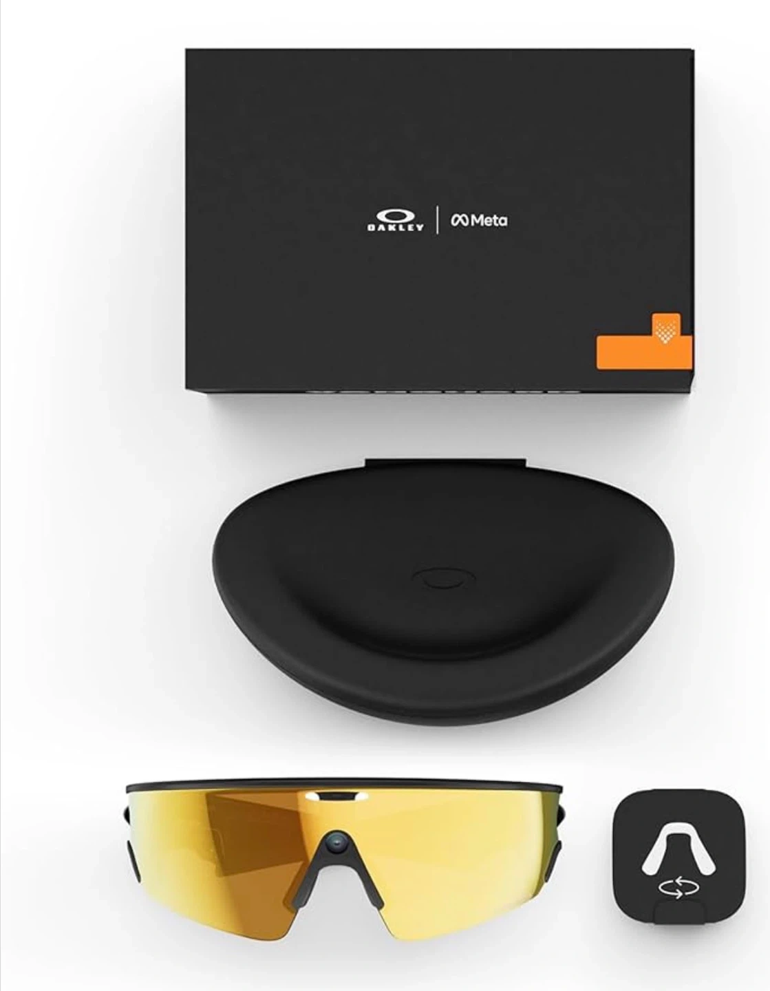 Oakley Meta smart glasses with a Prizm 24K lens. Includes original case, box, and charging accessories. These glasses offer augmented reality features and capture content.