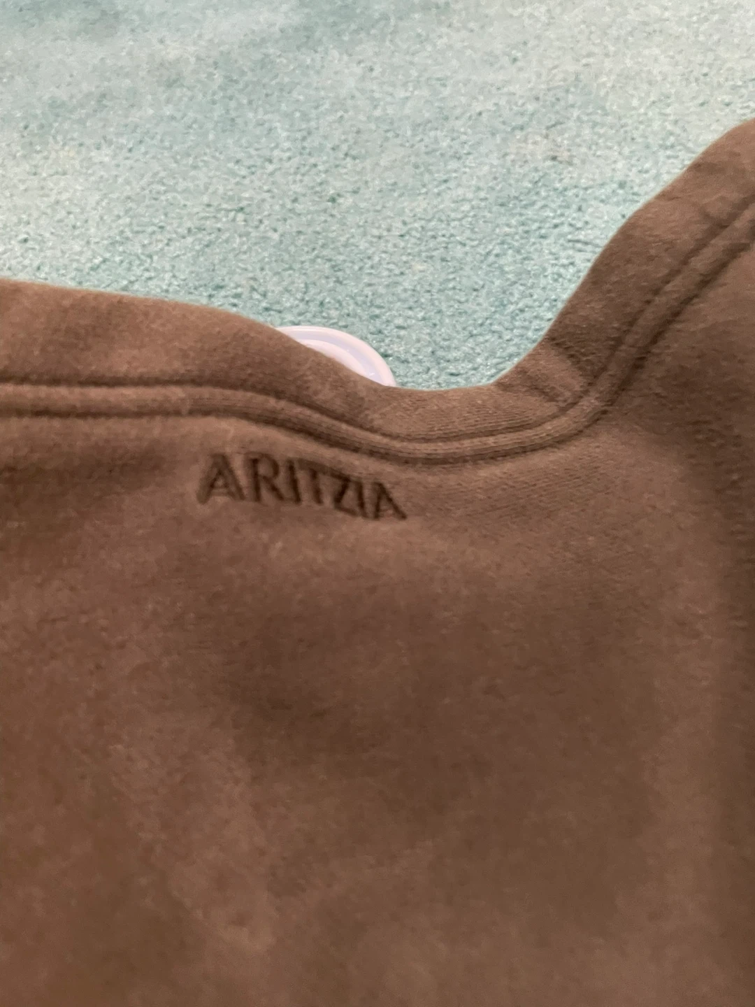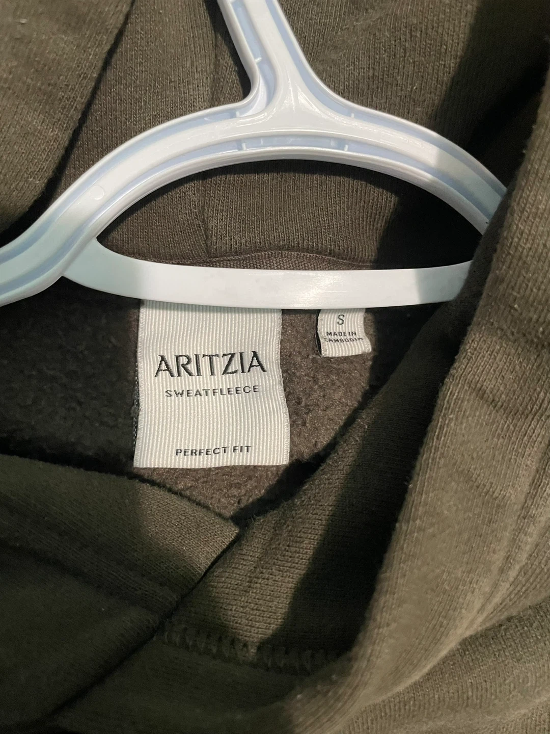 This Aritzia hoodie is made from their signature Sweatfleece fabric. It's a size small and comes in a dark green colour. It features a front pouch pocket.