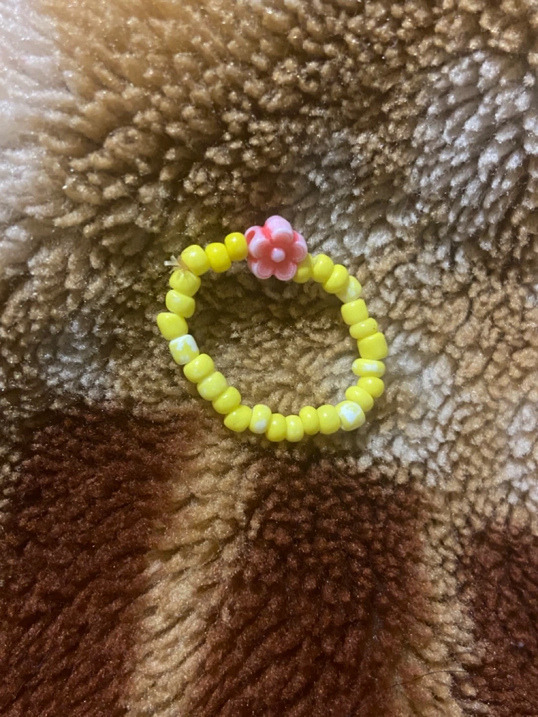This is a yellow beaded ring with a small pink flower detail. It is also stretchy. This ring is a fun accessory for adding a pop of colour!
