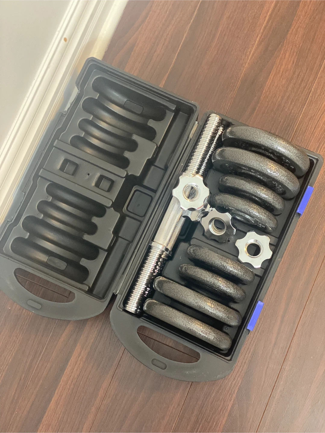 CAP Strength 40 lb adjustable dumbbell set with case. Includes 2 dumbbell bars, 4 collars, and 8 weight plates. Adjustable weights for custom workouts.