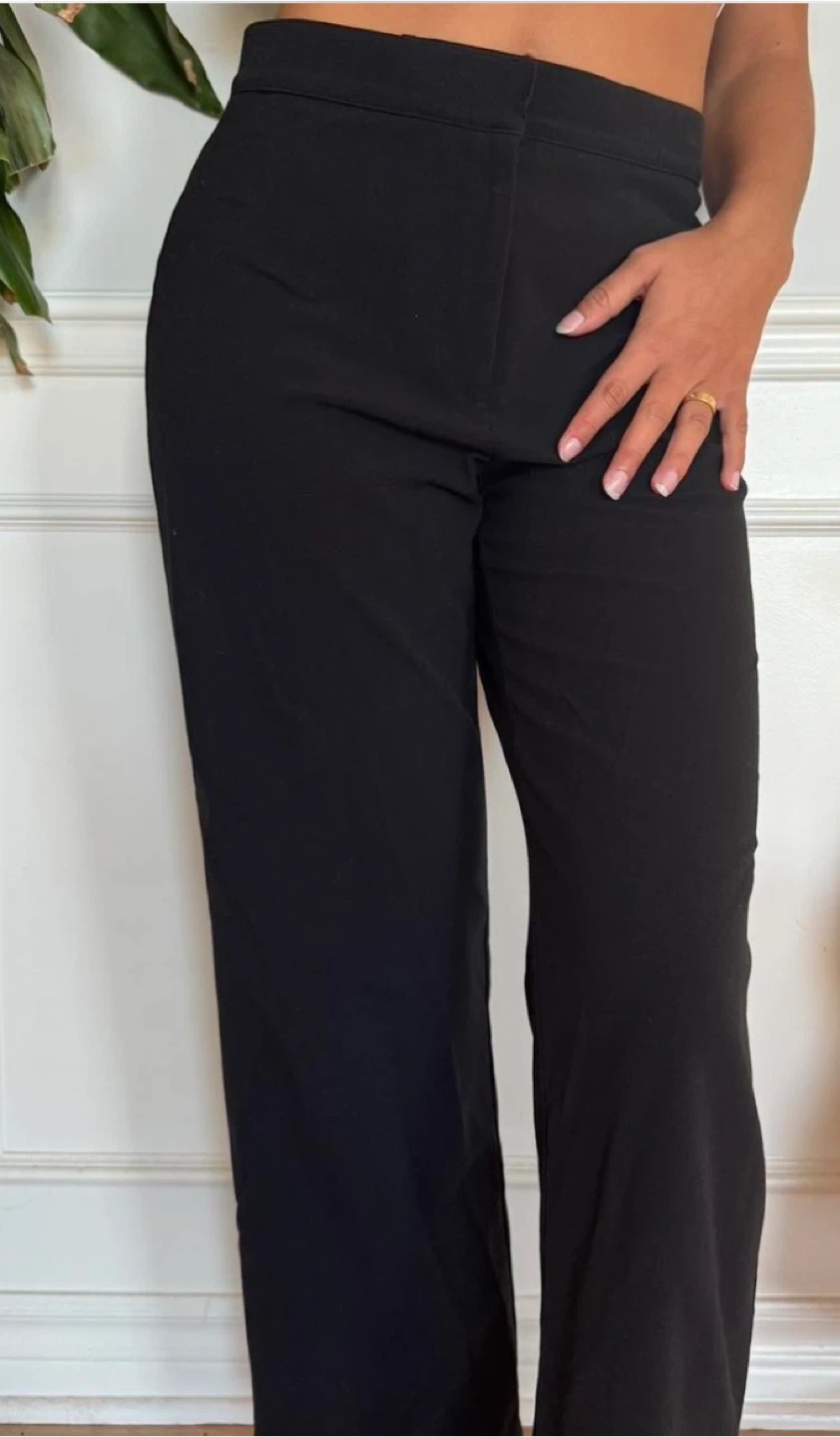 Classic black wide-leg trousers. They're made of a comfortable, breathable fabric. These pants offer a flattering silhouette and are perfect for casual or dressy occasions.