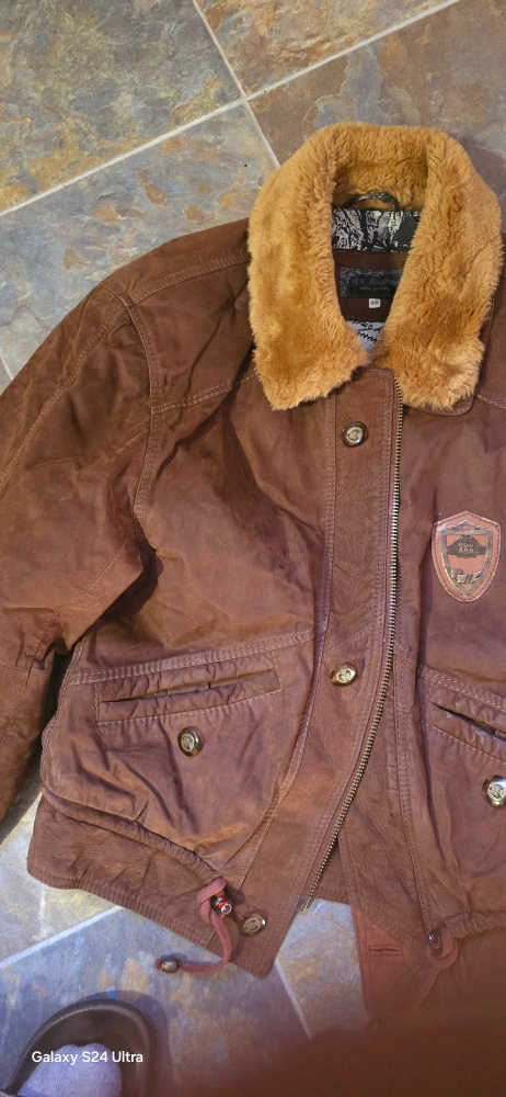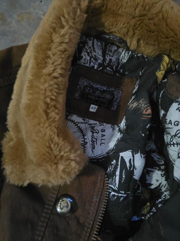 25Selling a Di Buzzato brown leather jacket! It's a size 46 and features a soft, fur-like collar. It looks like it was made in Italy. It's in great condition and ready for a new home