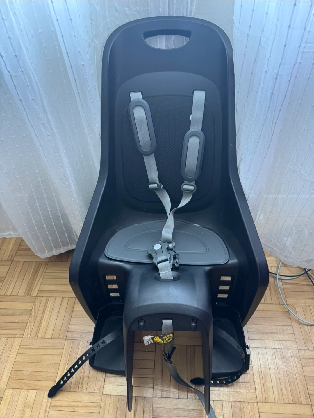 Black rear-mounted child bicycle seat. Includes all straps and hardware. Suitable for bicycles with carrier mounting systems. Used but beautiful condition.