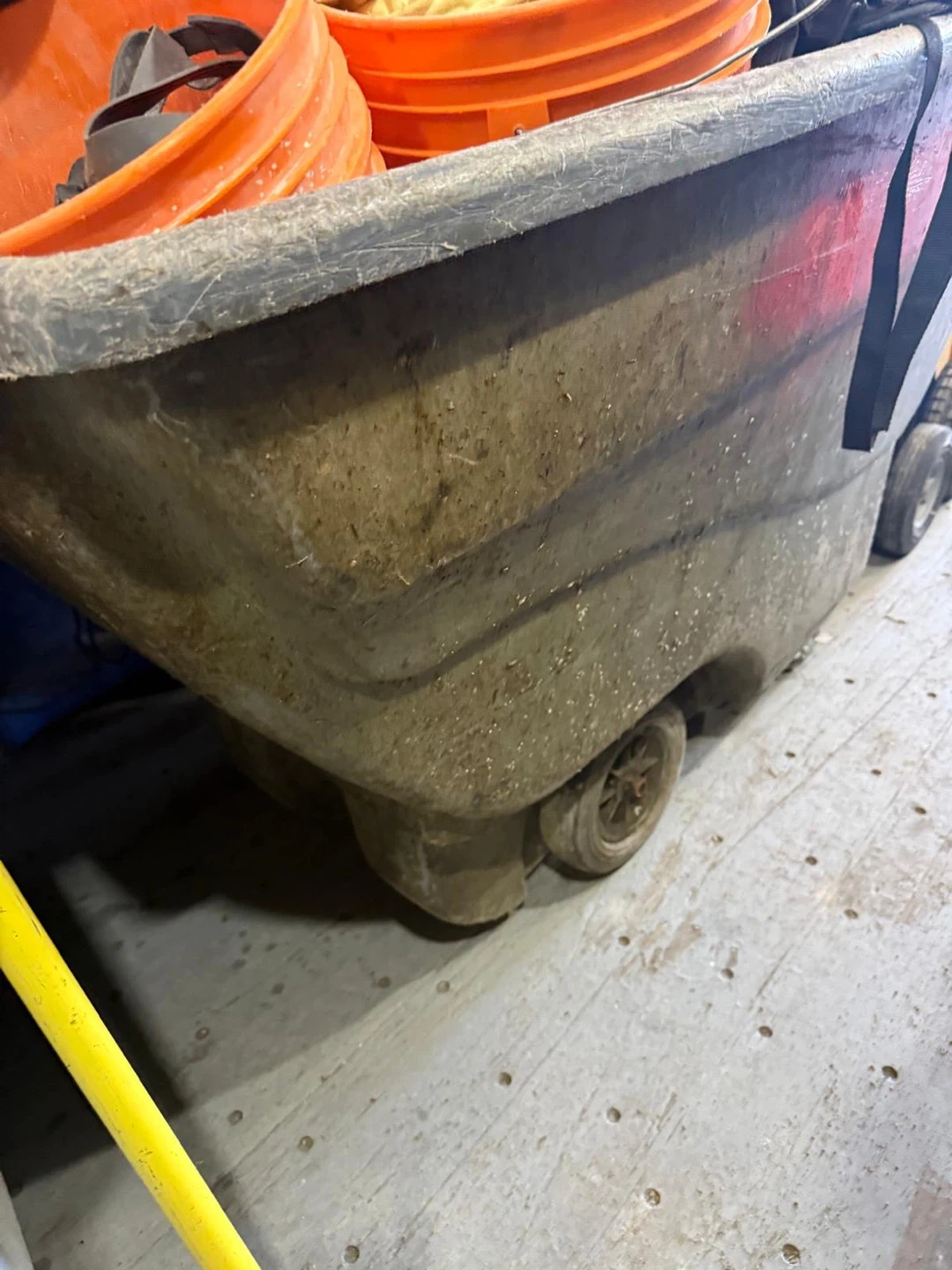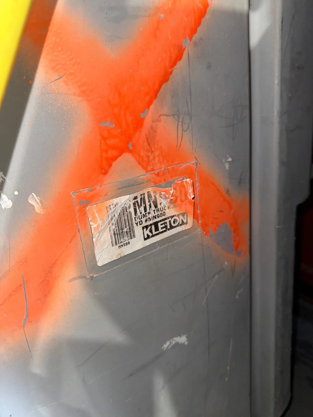 This is a Kleton dump truck, grey in colour, with wheels. It has been used for hauling purposes and shows signs of wear. It's a durable piece of equipment for moving heavy loads.