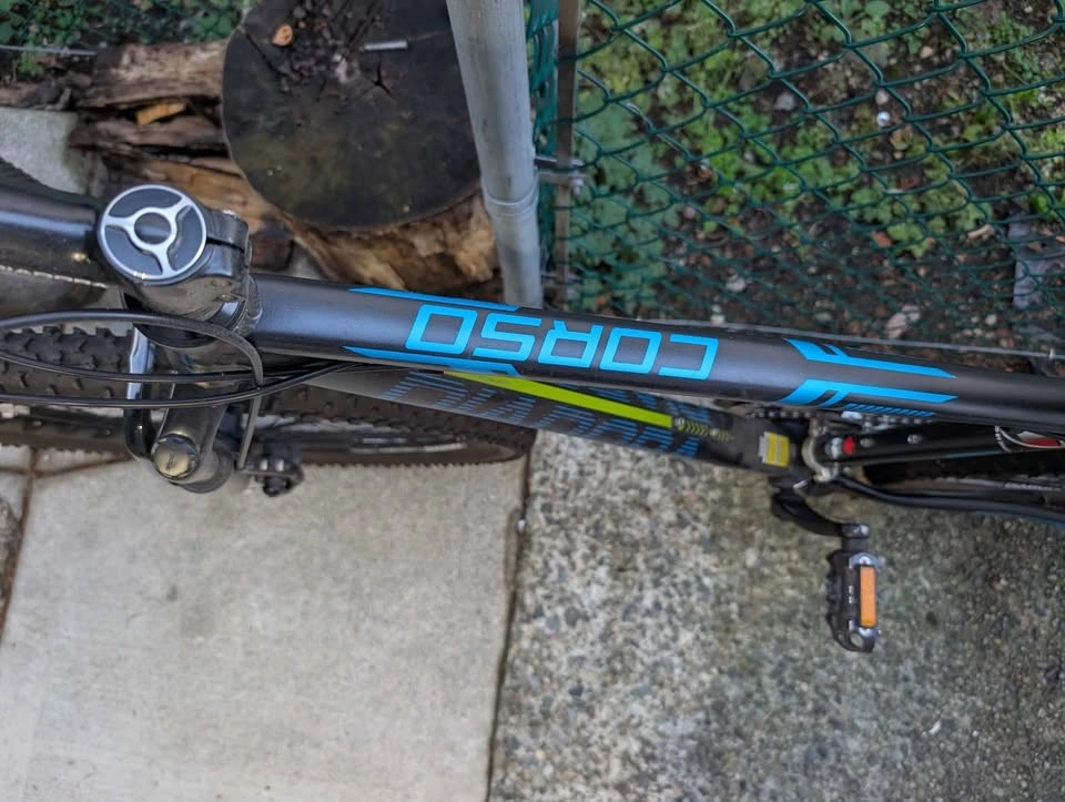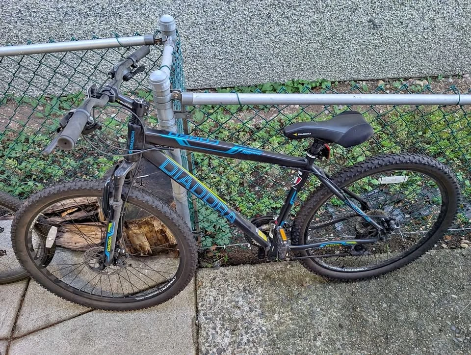 Selling my Diadora Corso mountain bike. This hardtail is an excellent starter bike for hitting the park, cruising the urban trails, or just getting groceries without walking! It’s been a champion of passive storage for the last three years, hanging faithfully on its wall hooks in the garage. The Good, Honest Facts: Mechanically Sound: Everything works! Brakes stop, wheels turn, and the suspension fork still gives you a bit of cushion up front. Good Bones: Diadora is an entry-level brand (I originally bought it from Sport Chek), but this model offers a sturdy frame and decent components for casual riding. Tires are Solid: The rubber is in good condition with plenty of tread left. The "Needs TLC" Section: A Spa Day: It's collected a few years of garage dust. It needs a good wash and a thorough cleaning. A Drink of Oil: The chain and gears will need a bit of fresh oil and a minor tune-up to shift perfectly smooth after sitting for so long. Minor Scratches: It has some minor cosmetic scratches from being moved around, but nothing serious. If you are looking for an affordable, reliable, and functional bike that only requires a little bit of sweat equity (and chain lube!), this Corso is ready for its next adventure. First come, first ride! Message me to arrange a viewing. If the ad is visible, it’s still available. Wheel Size: 27.5" (650B)