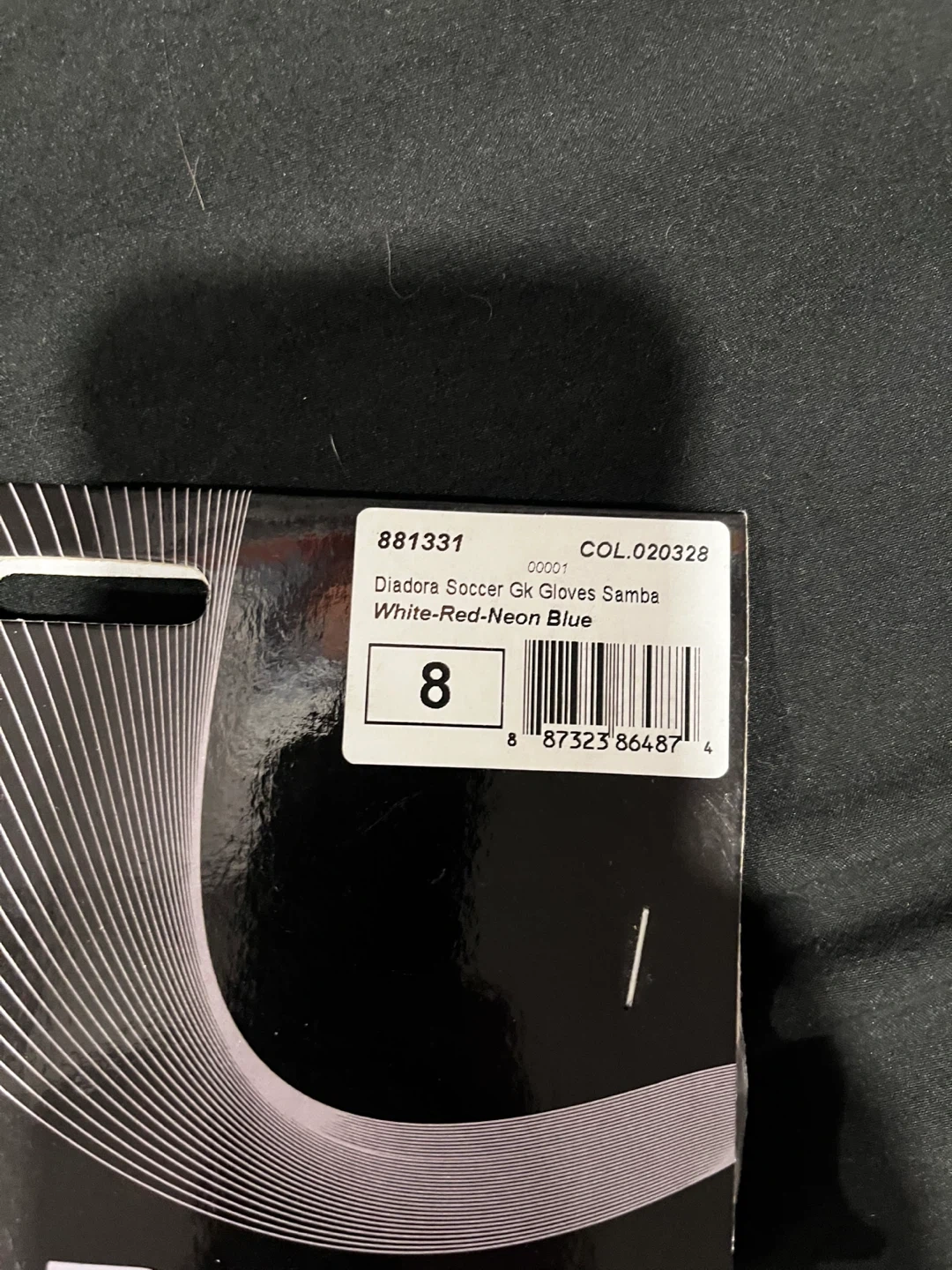 Selling a brand new pair of Diadora Soccer Goalie Gloves, Samba model, in size 8. The gloves are white, red, and neon blue. They are still in the original packaging.