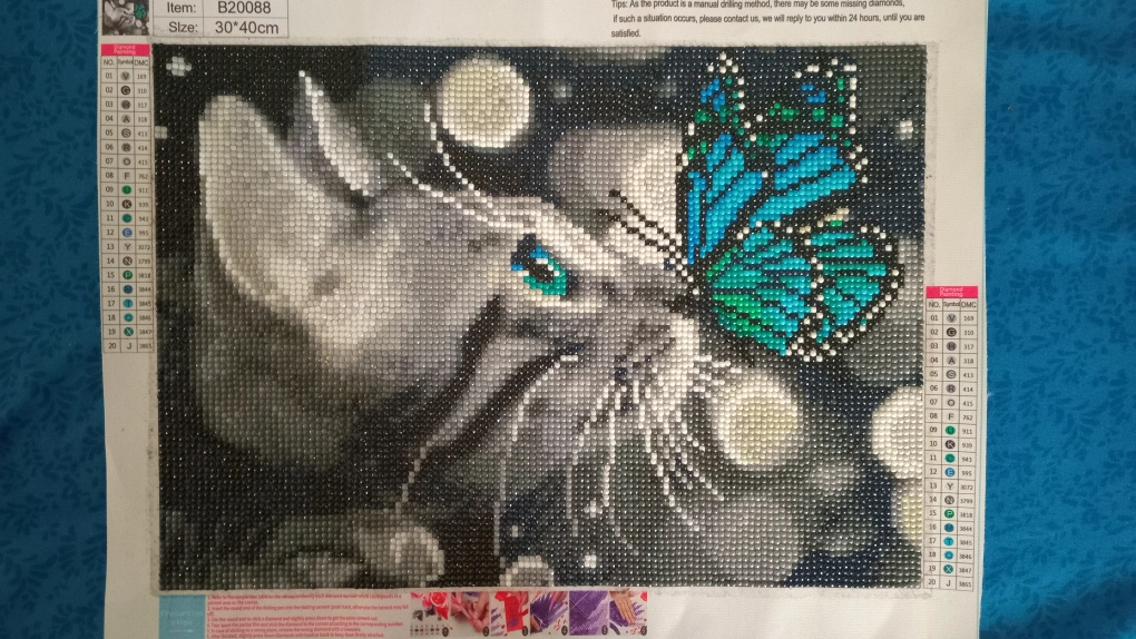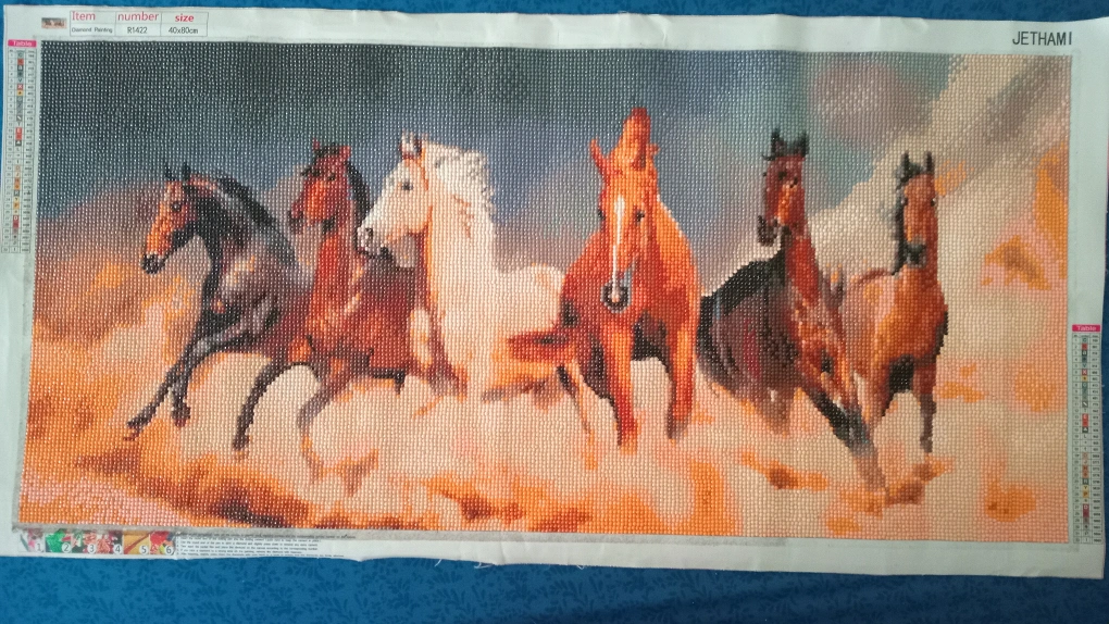 Two unfinished diamond painting kits. One features a grey cat and a butterfly, the other depicts five horses running. Both are on canvas and include all necessary components. Size details in photos.