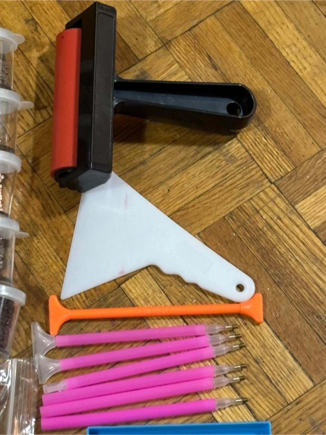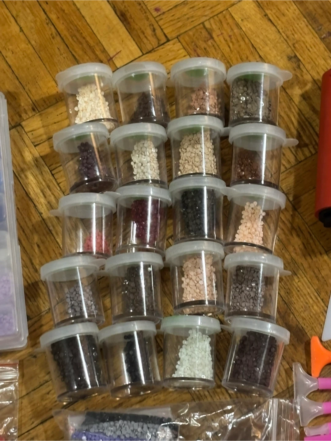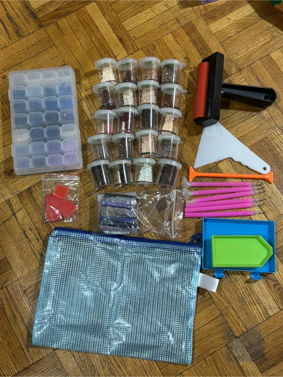 Diamond painting kit with lots of different coloured beads, tools, and containers!