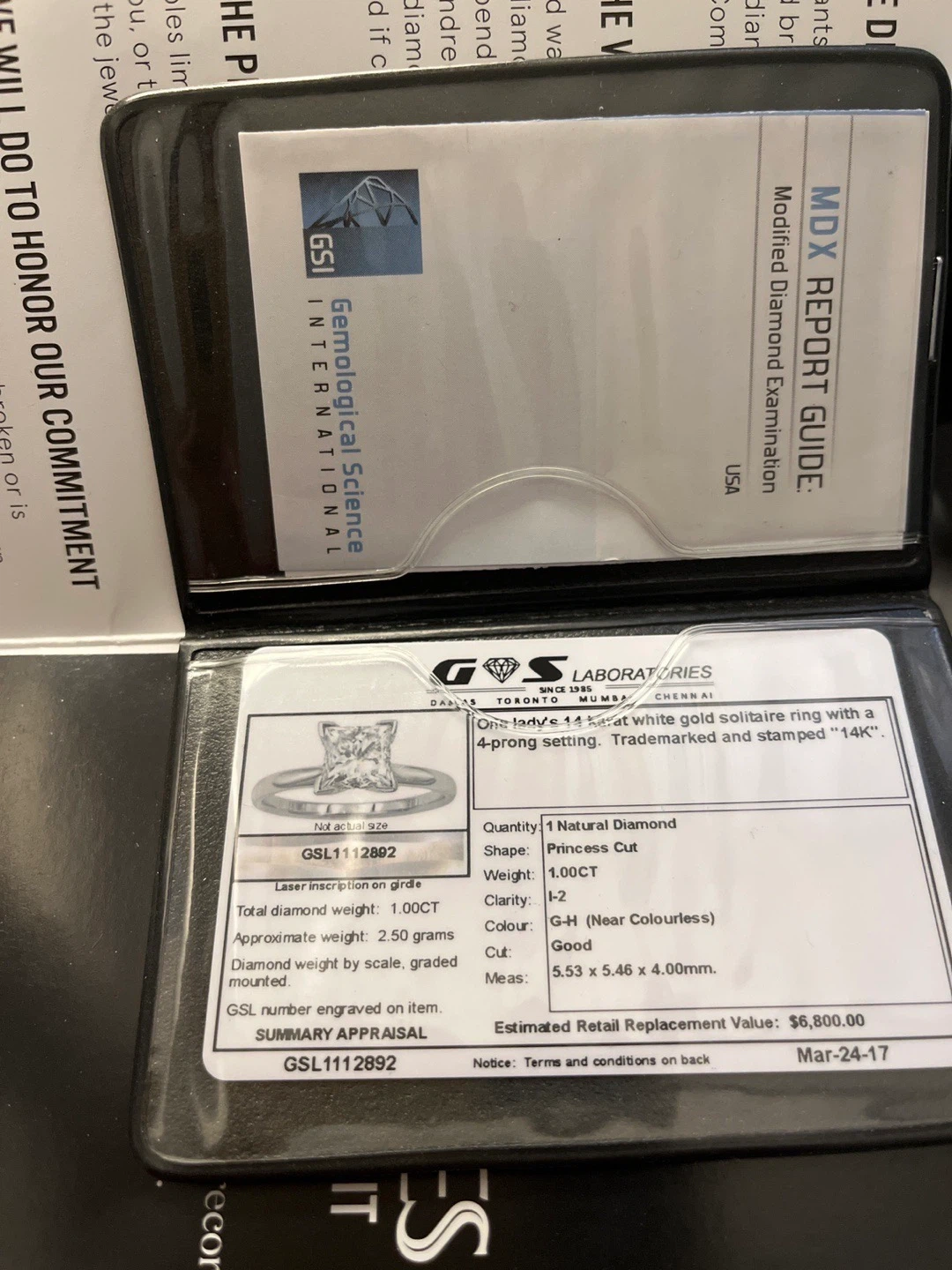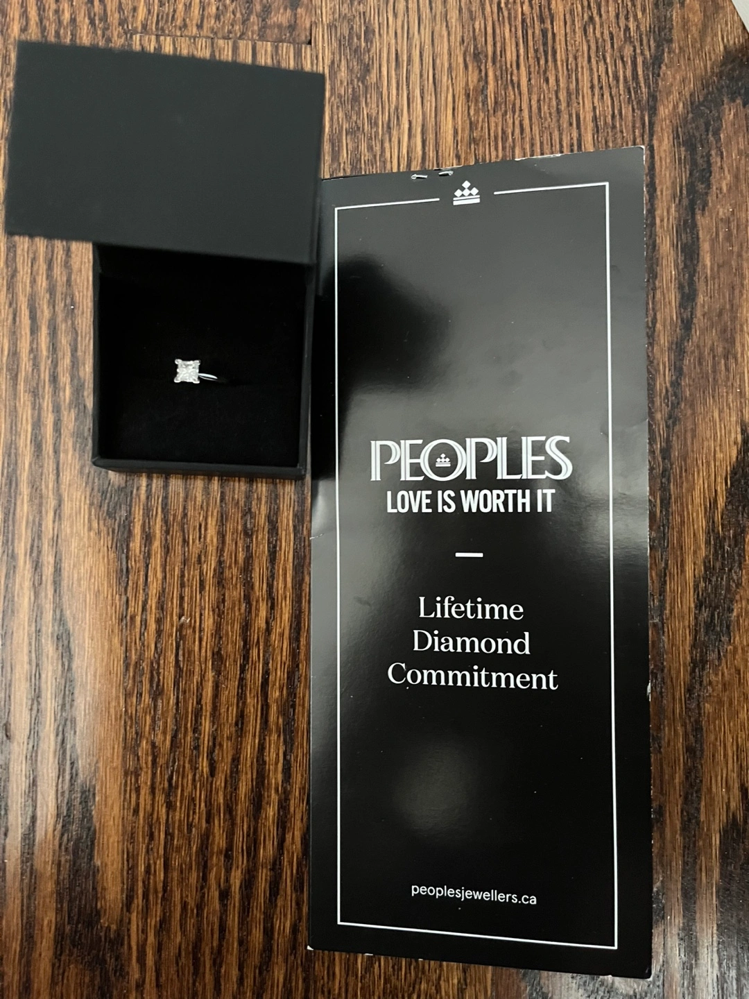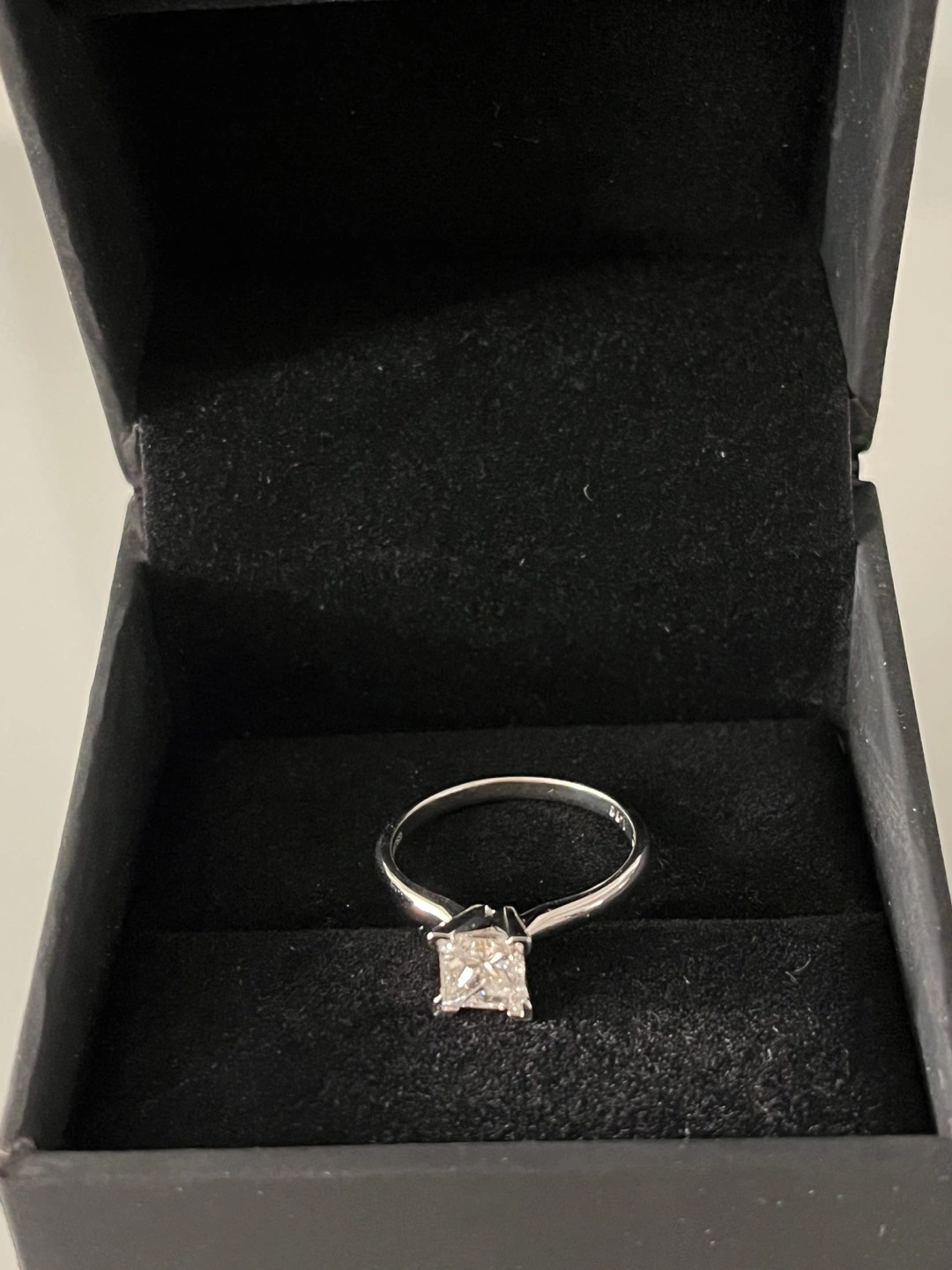 235Bought from Peoples Jewellers in 2022, 1.0 Princess-cut solitaire diamond ring. 14 karat. It’s never been used. Presented in a black box with original packaging and certificate Lifetime Diamond Commitment. Originally bought for $4000.