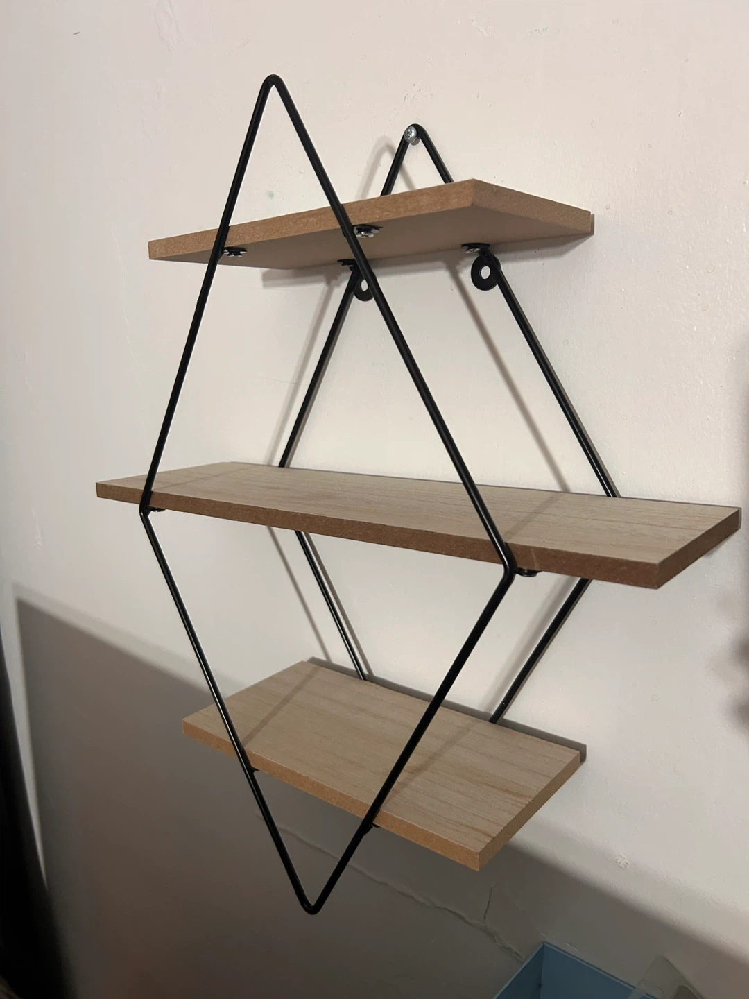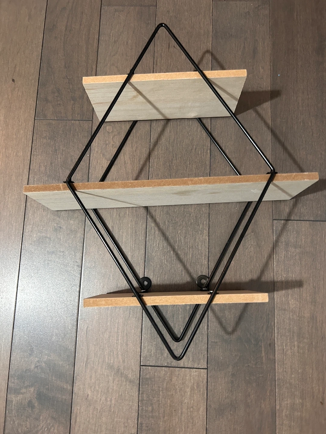 Here's a cute diamond-shaped wall shelf! It's perfect for adding a touch of modern style to any room. The shelf features a black metal frame and light wood shelves. It's in great condition and ready to be hung up and enjoyed