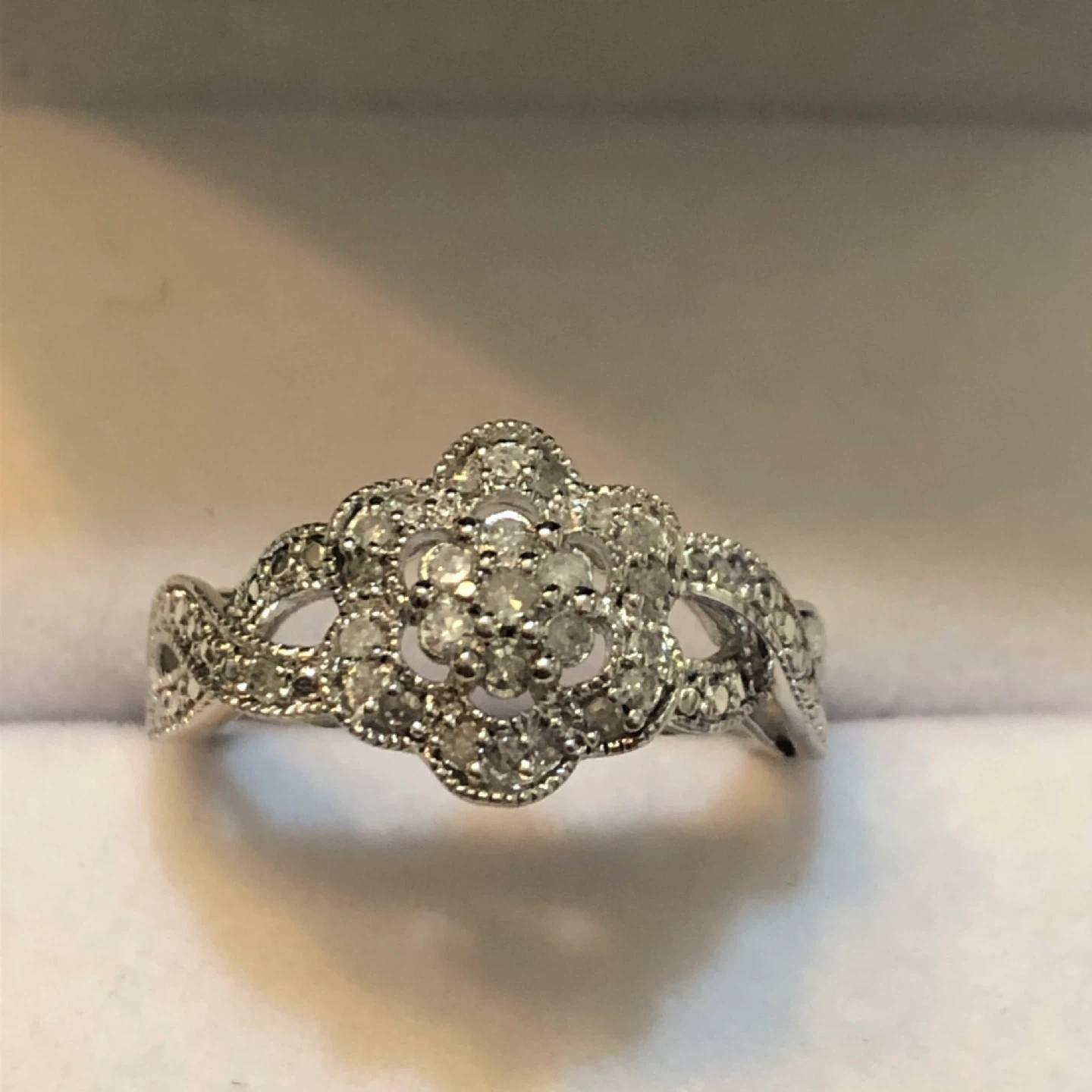 Selling a beautiful sterling silver ring marked with '925', indicating its silver purity. It features an intricate design with what appears to be small, sparkling diamonds stones. It's in great condition and ready to add a touch of elegance to your collection