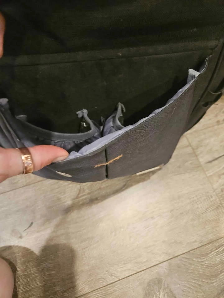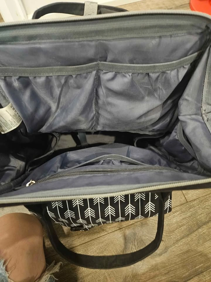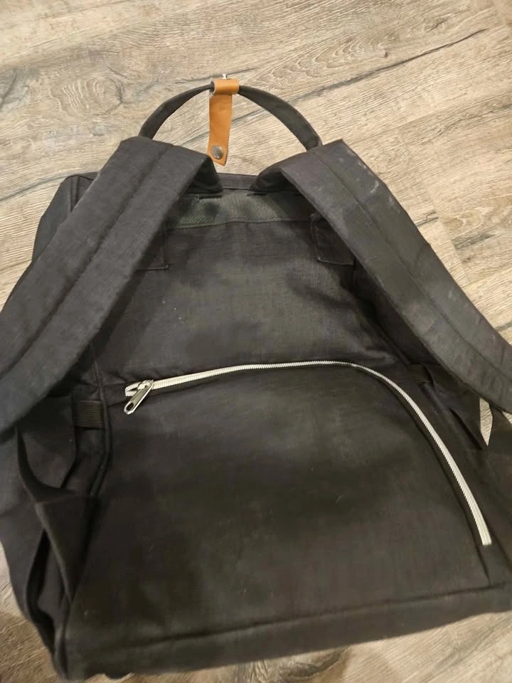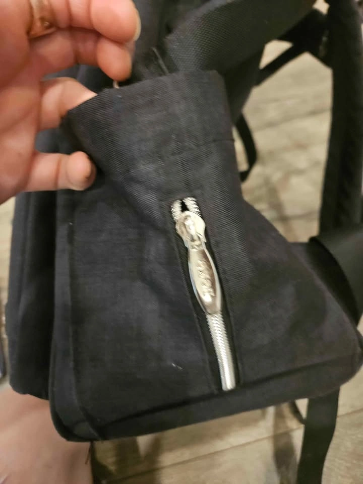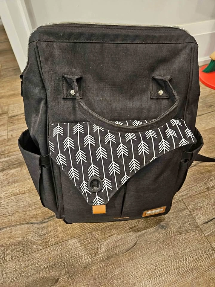 Like new diaper bag backpack with lots of zippered pockets. Adjustable straps. Side pocket zipper for wipes. Comes with clean change pad. No rips or stains. Front pockets are insulated.