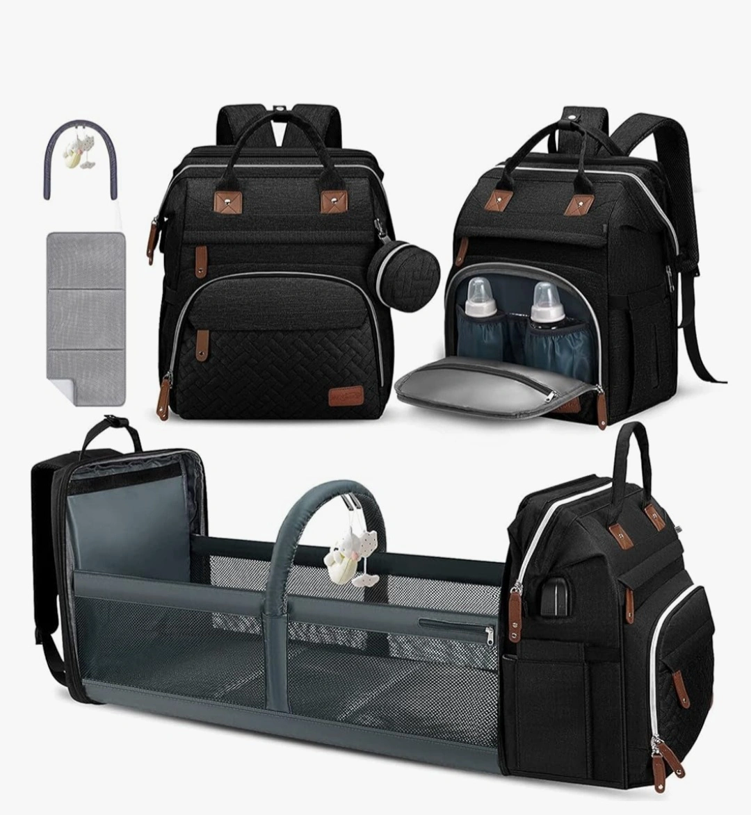 17Brand New. This is a diaper bag backpack that also converts into a bassinet! It's perfect for parents on the go. The bag is green.and features multiple compartments for bottles and other baby essentials. It also comes with a changing pad and a detachable mobile for the bassinet.