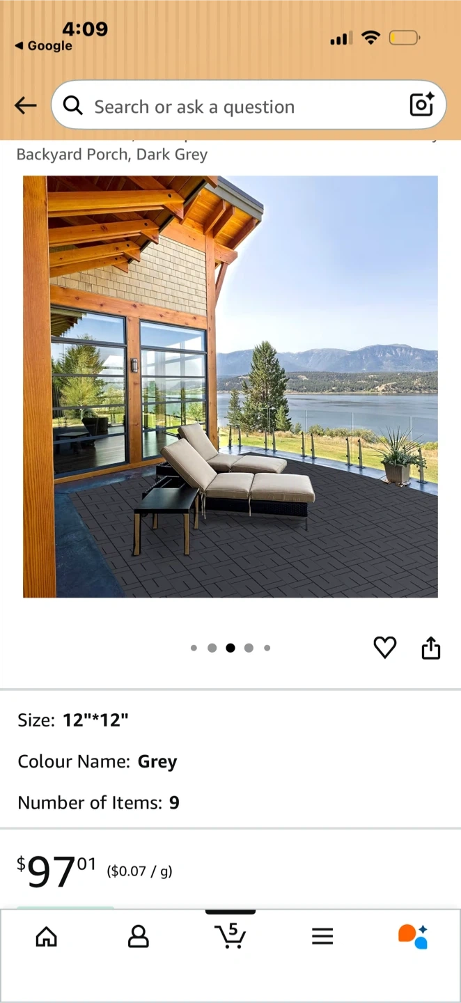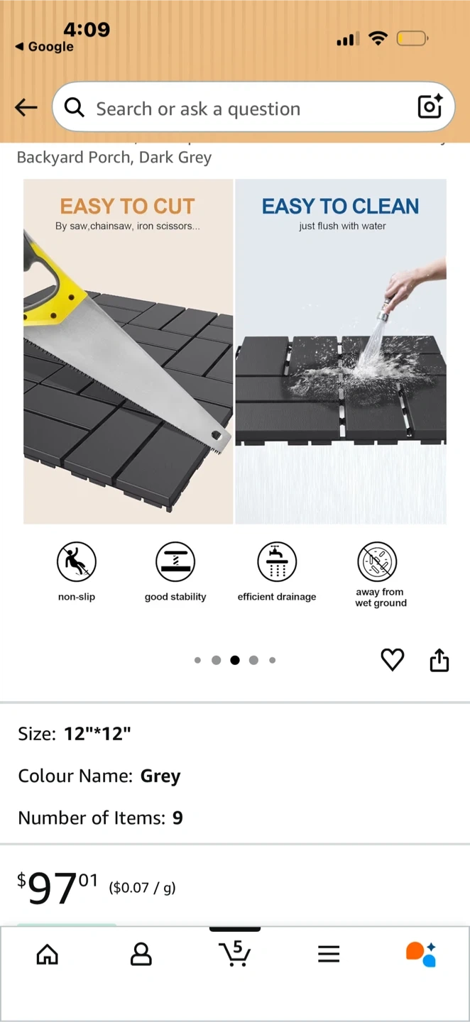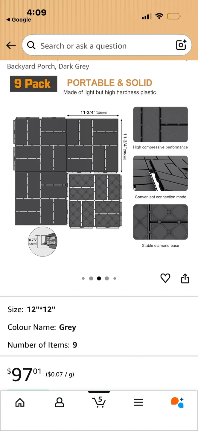 These backyard porch tiles are 12"x12" and come in a dark grey colour. They're made of high-hardness plastic with a stable diamond base and efficient drainage. The tiles offer non-slip and good stability, making them great for outdoor areas.