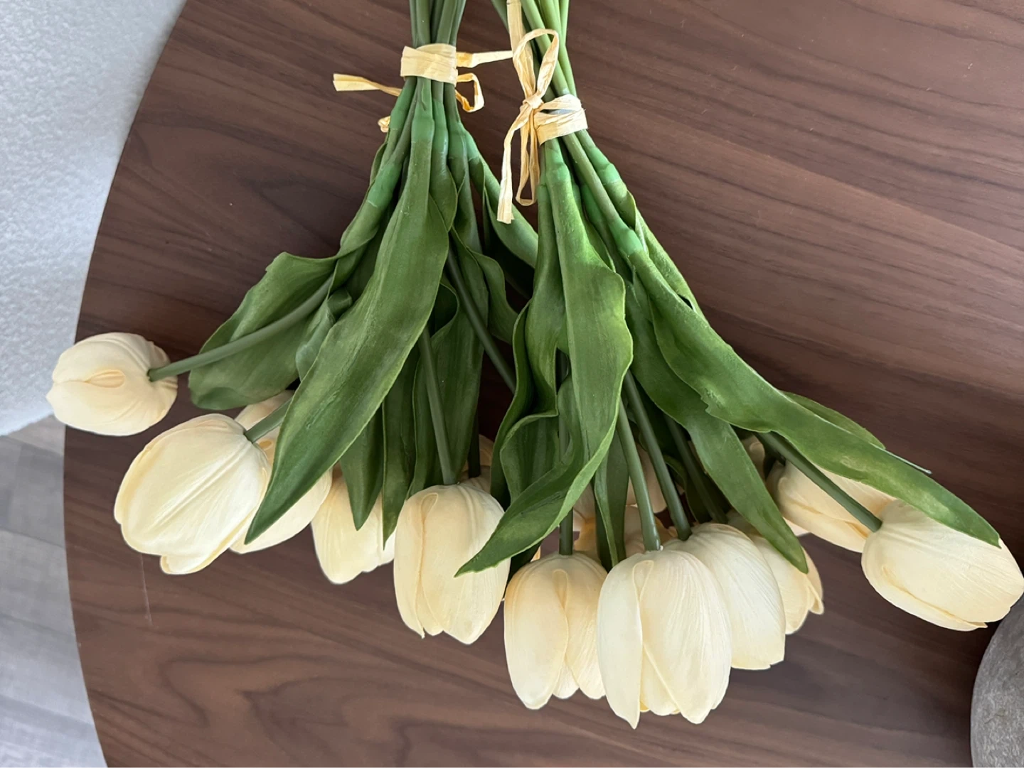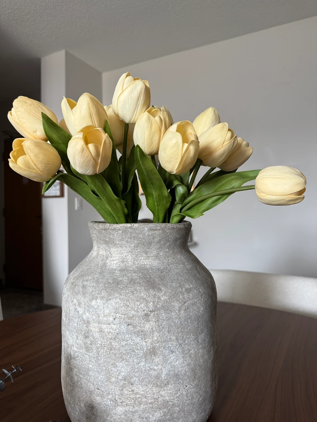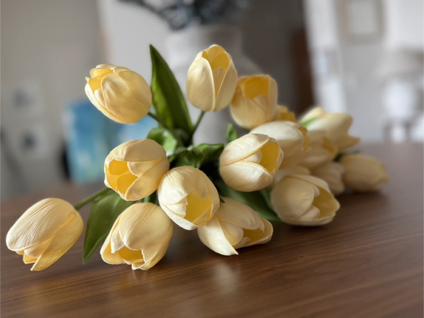 A bouquet of artificial yellow tulips, perfect for adding a touch of spring to any room.