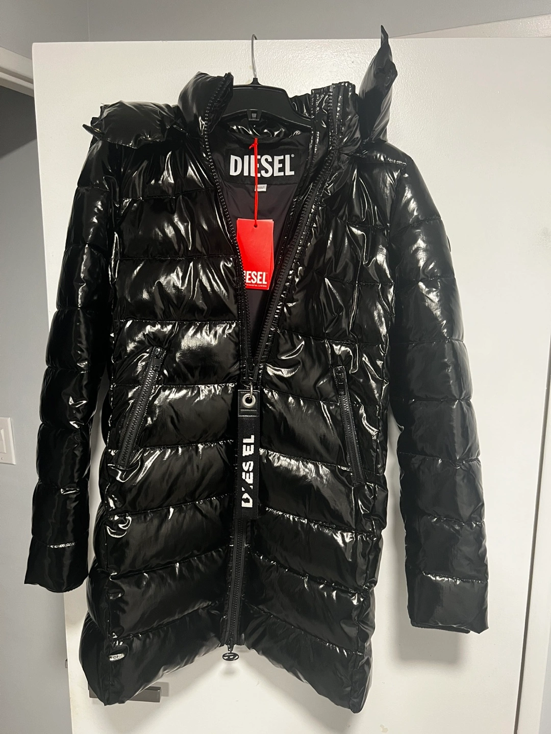 Women's long black puffer jacket. Shiny material. Hood. Zipper closure. Excellent condition. Brand new with tags.