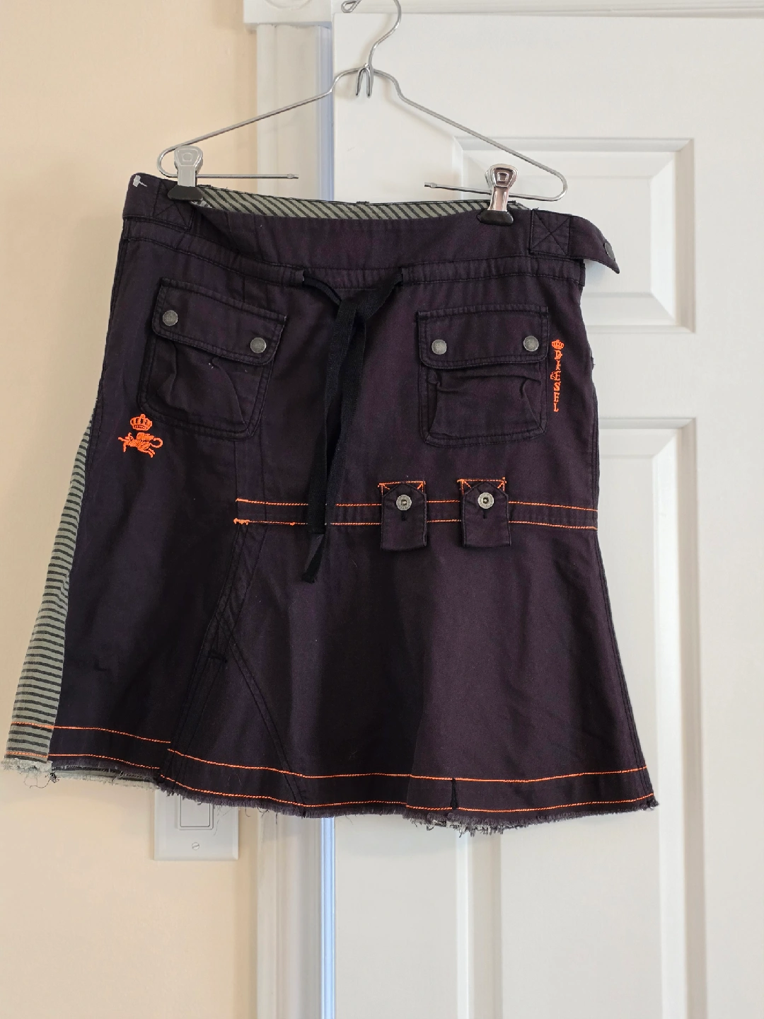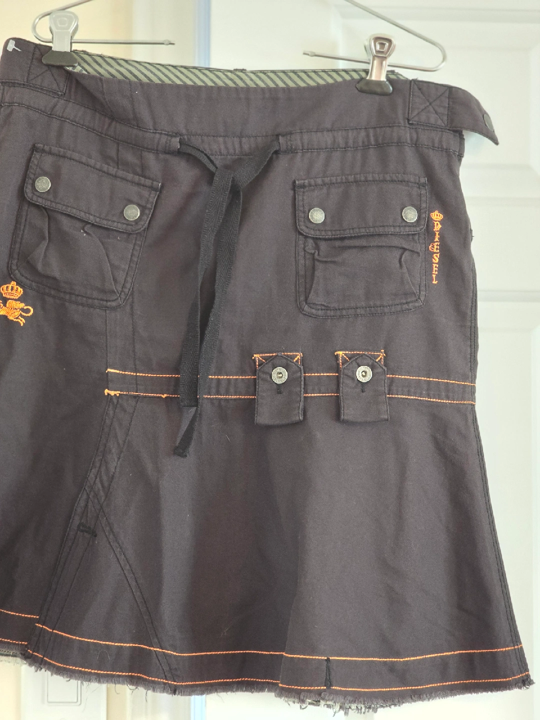 Diesel, Вlack skirt with orange detailing. It has a drawstring and pockets. Perfect for a casual look! Pockets Grunge Mid Length Skirt Cotton Olive