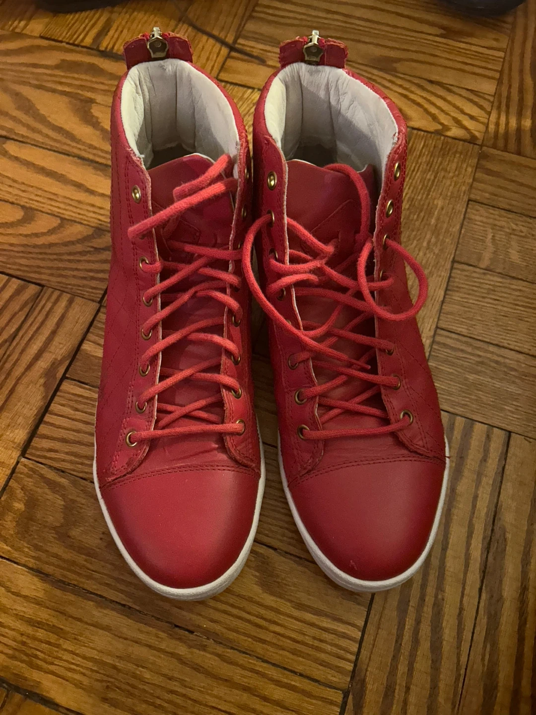 These are a pair of Diesel red leather high-top sneakers. They feature a unique zipper detail on the back and a gold accent on the sole. The shoes are in good condition, perfect for adding a pop of colour to your outfit!