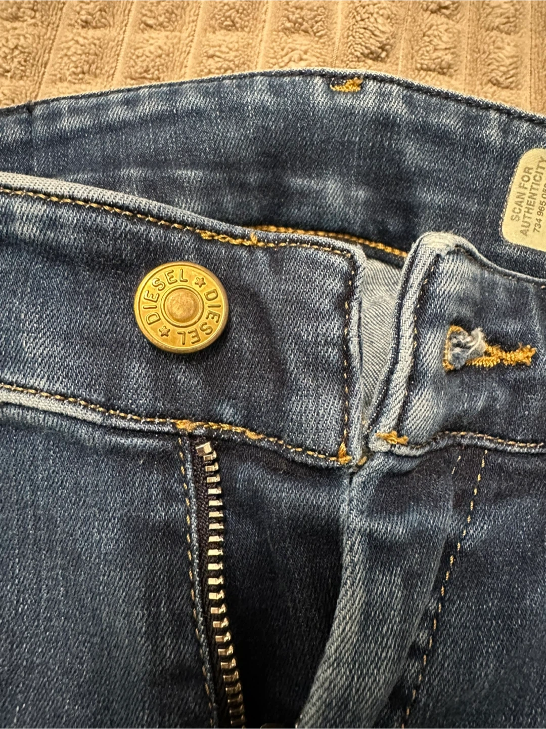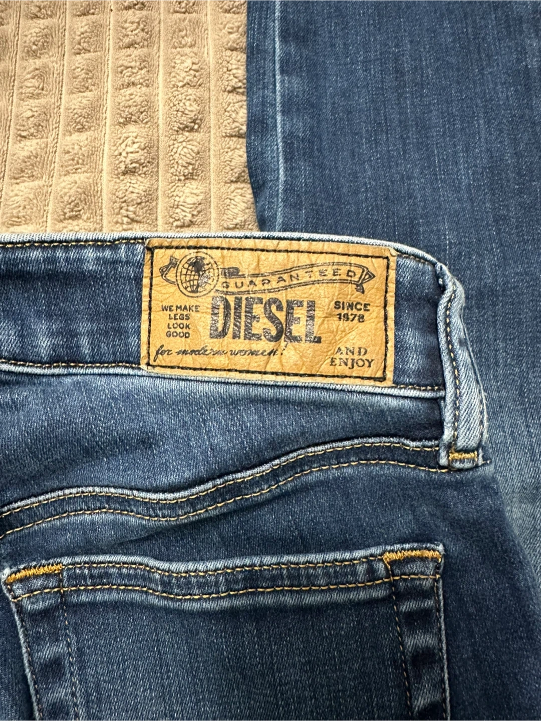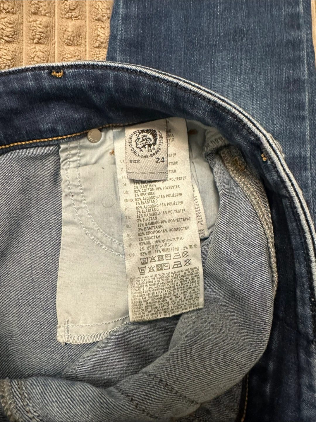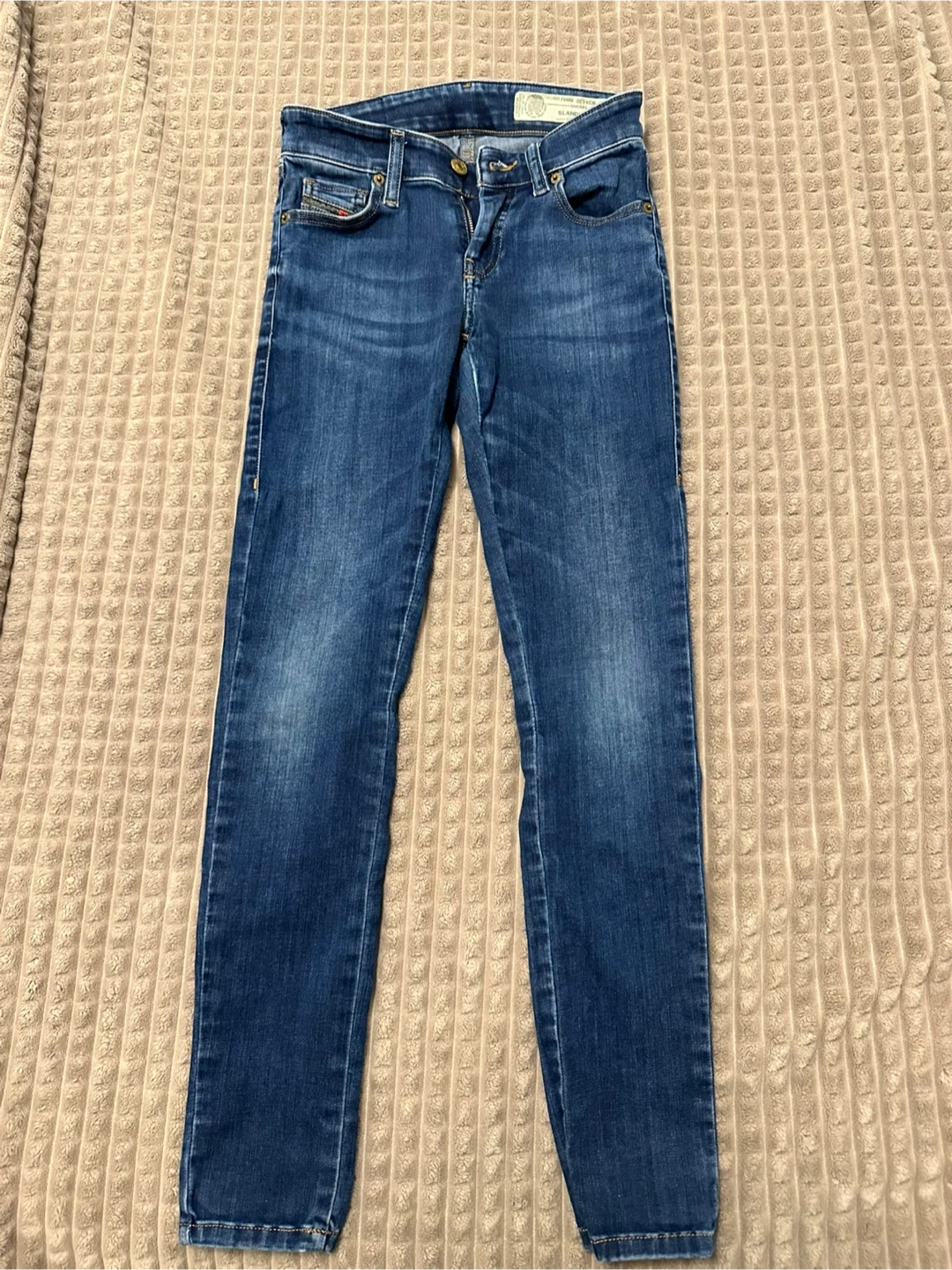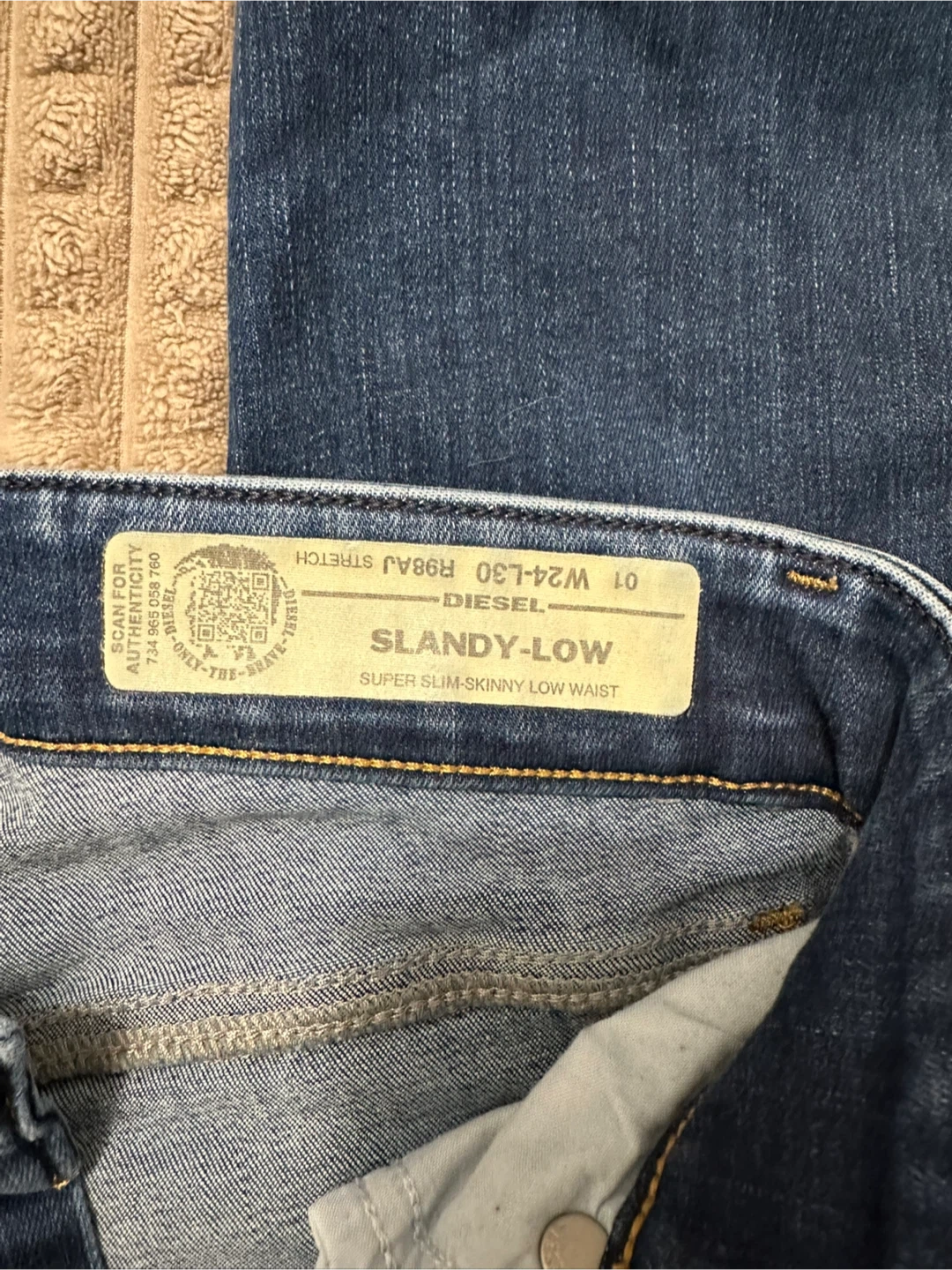 Diesel Slandy-Low super slim skinny jeans in size W24. They are a dark blue wash and made of 92% cotton, 6% elastomultiester, and 2% elastane. These jeans are in great condition and ready for a new home!