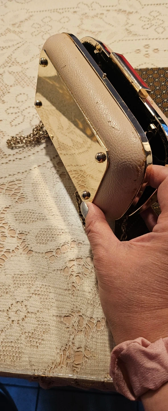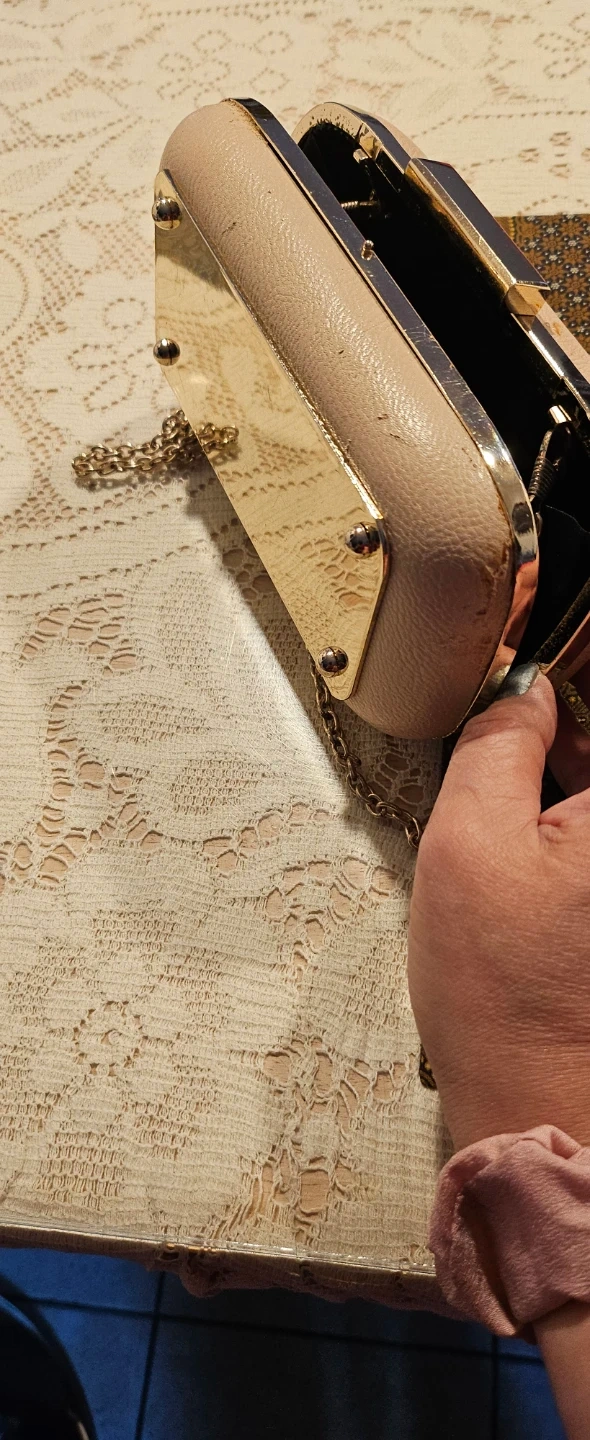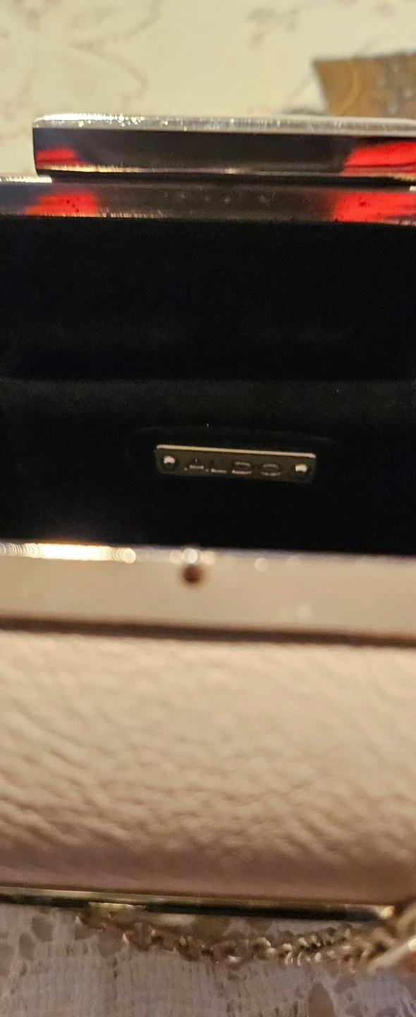 This is an ALDO clutch purse in a pale pink colour. It comes with a detachable silver chain strap. Interior is lined with black fabric and a mirrored on the side.