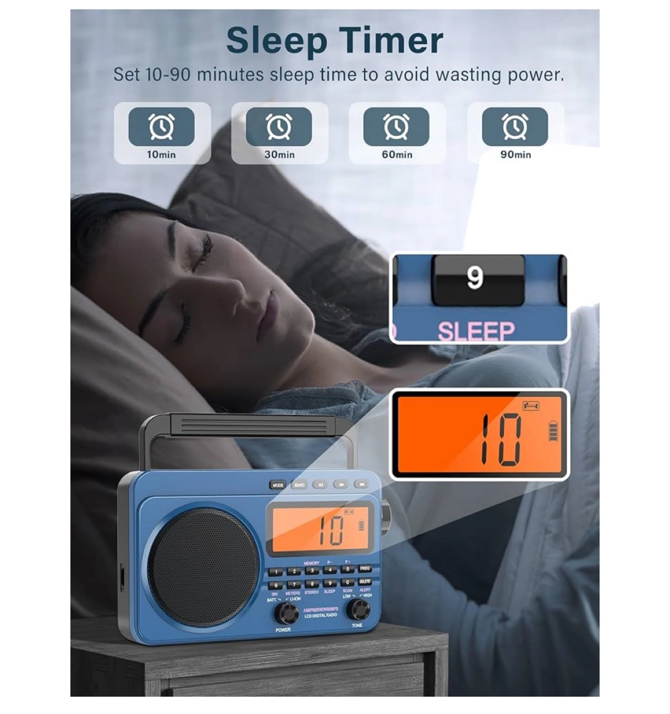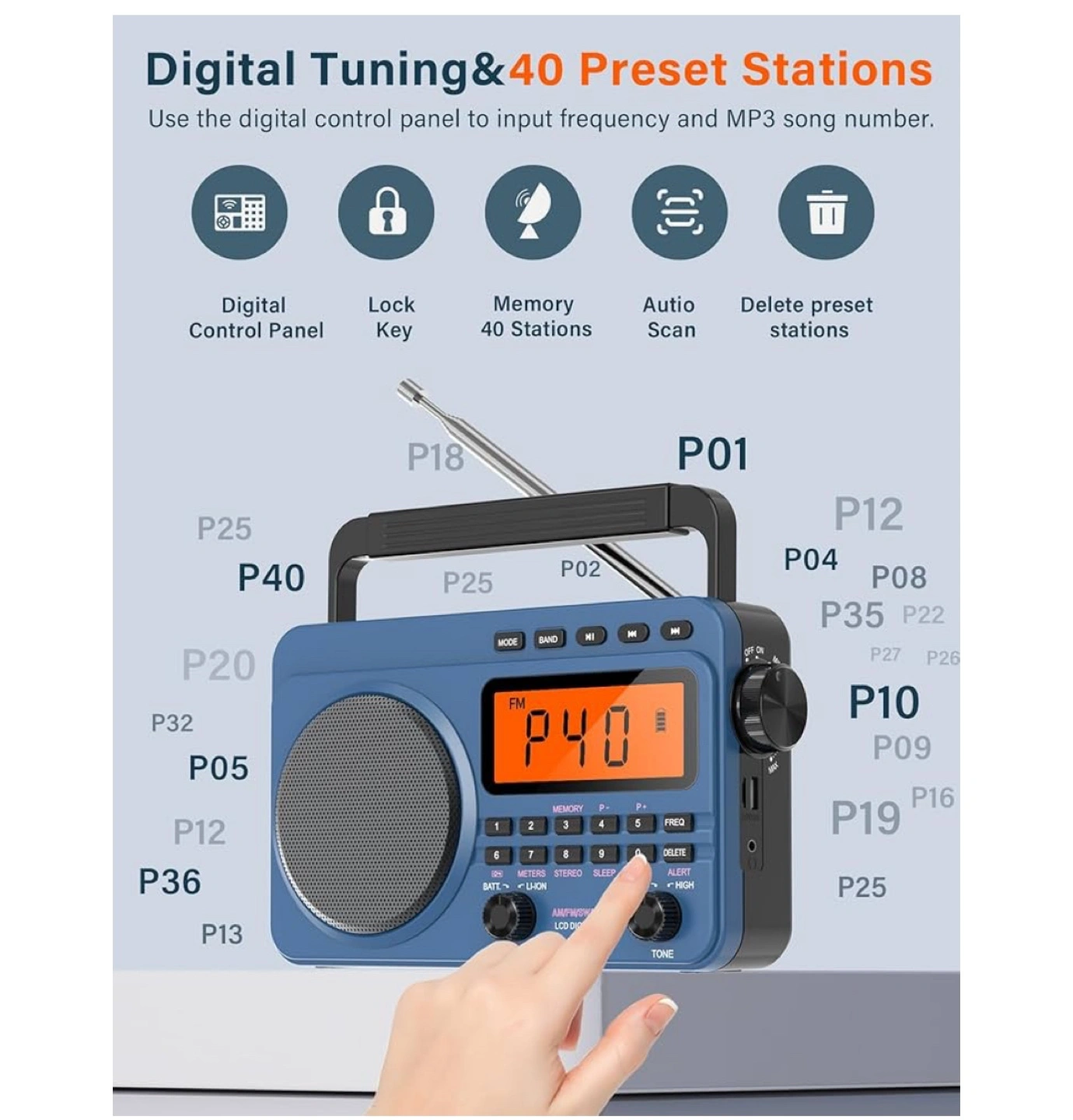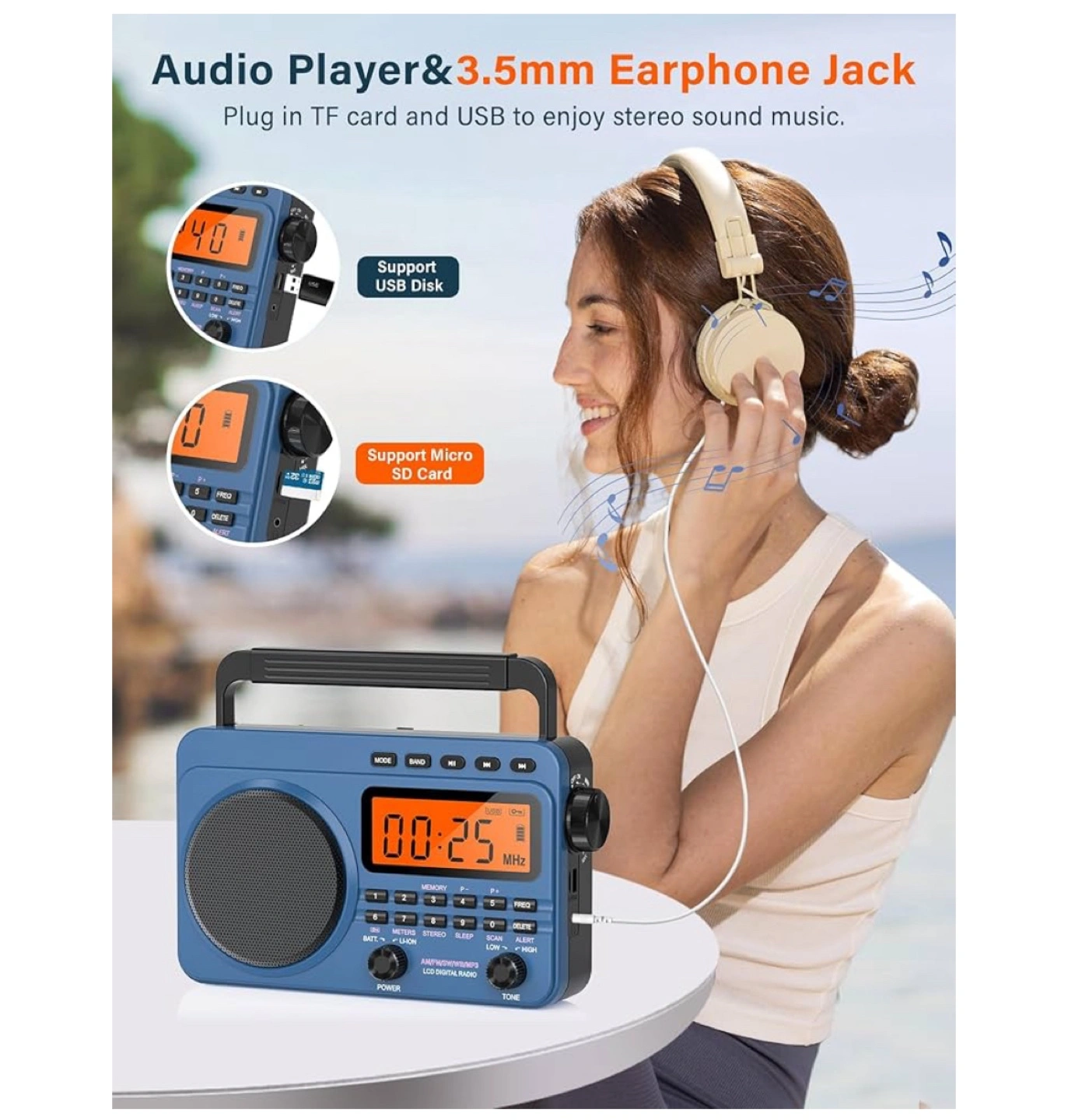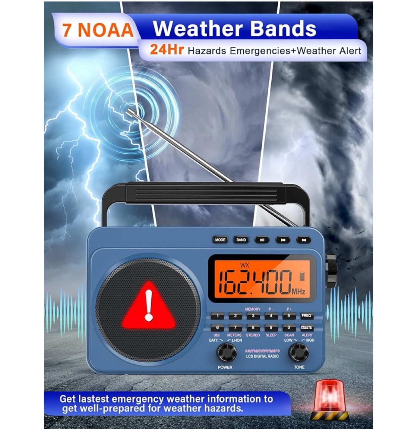 72Brand Sunoony Colour: Blue Special Feature: Rechargeable Connectivity Technology: USB Product Dimensions: 25.3L x 9.7W x 20H Centimetres Tuner Technology: AM/FM/SW [4-Band Radio with Weather Alert] The portable radio supports multiple bands, including AM, FM, SW, and WB. This emergency NOAA radio has been specially designed for emergencies. This weather alert radio can alert hazardous weather in your area, such as hurricanes, tornadoes, and severe snowstorms, providing critical time for you. The longer antenna and advanced DSP chip ensure a strong and stable signal, allowing you to listen to music, sports, and news stations, whether at home or outdoors. [4000mAh Battery & 4 D Cell Batteries] This battery-powered radio is designed to be used in the event of a power outage, with two power supply options. The 4000-built-in battery allows you to use it during power outages or outdoor adventures, eliminating the need to purchase dry batteries. Additionally, the shortwave radio supports inserting 4 D Cell batteries (not included), enabling you to continue connecting and receiving broadcast news even in the absence of power. [Music Playback & Digital Tuner] USB & TF Card Function: Utilize this weather emergency radio as an MP3 player by inserting a TF card or USB drive into portable shortwave radios. The number buttons enable seamless song selection on this battery-operated radio. Digital Radio AM/FM: Supports automatic/manual station search and storage (120 preset stations in the AM/FM band). Number keys facilitate direct frequency input, and manual station deletion is possible. Larger Display with Backlit: Equipped with a large LCD screen, clear visibility of AM/FM/shortwave radio stations during tuning. An orange backlight illuminates the display, making it ideal for nighttime use, especially for senior citizens. Portable Design: This portable AM/FM radio features a compact handle, enabling convenient transportation to listen to your favourite music and news. Sleep time shutdown mode automatically turns off the shortwave radio. Additional Convenient Features: - Keylock function for anti-false-touch - Sleep timer of up to 90 minutes - External antenna input - 3.5mm earphone jack Exquisite Appearance & Simple Operation: This portable AM/FM radio combines an exquisite design with user-friendly functionality
