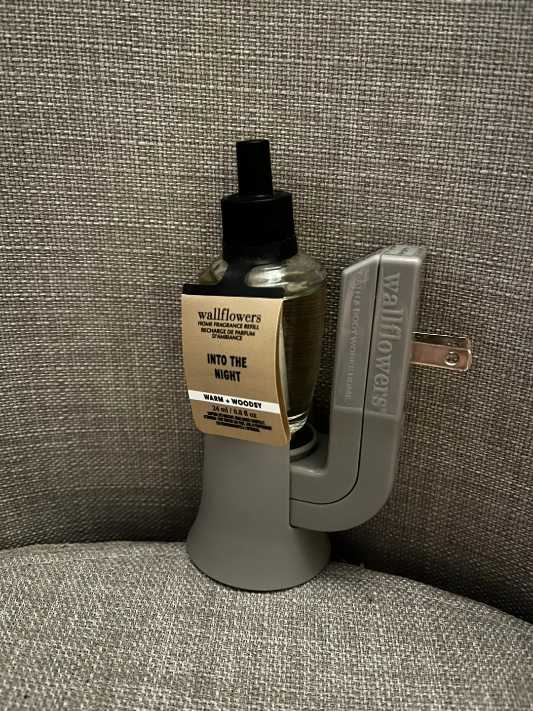 This is a Bath & Body Works Wallflowers fragrance refill in the scent 'Into the Night'. It's a warm, woodsy scent. The refill is 24 ml / 0.8 fl oz.