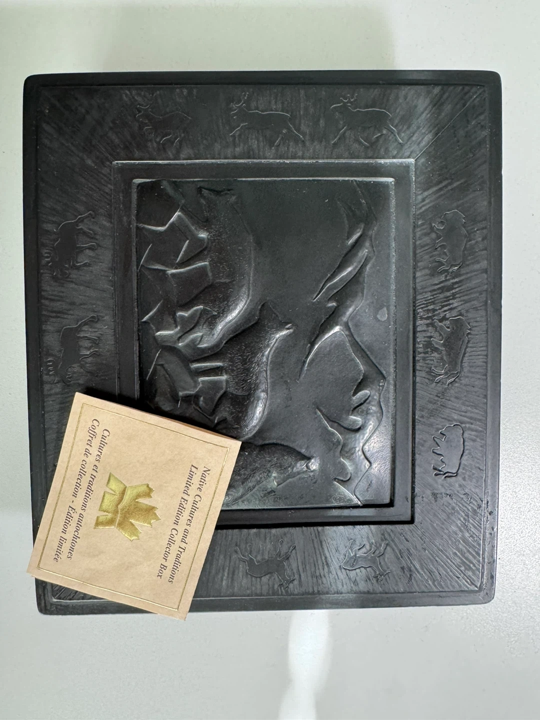 This is a Nature Stone limited edition collector box, "Native Cultures and Traditions". It features embossed art of Indigenous animals and a profile. Made in Canada.
