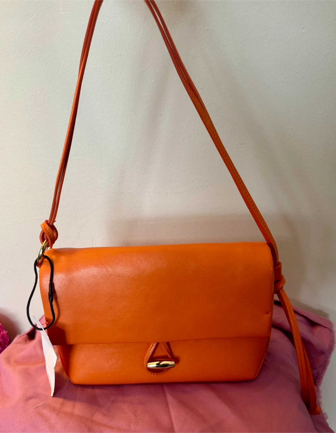 This is a Mango Bolso Messenger bag in a vibrant orange colour. It's a stylish and practical bag for everyday use! The tag shows the original price was $95.99.