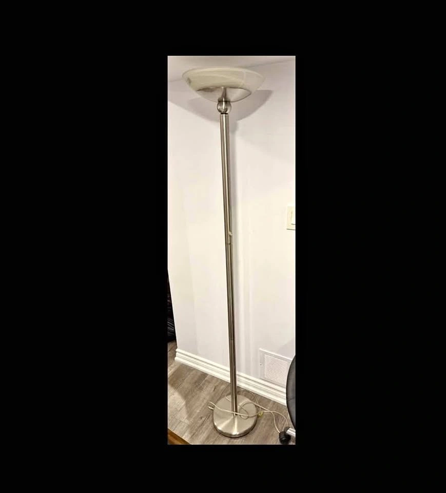 Used for staging, perfect condition. Dimmable with knob. Silver metal with off-white shade. Built in long lasting bulb. Solid base.