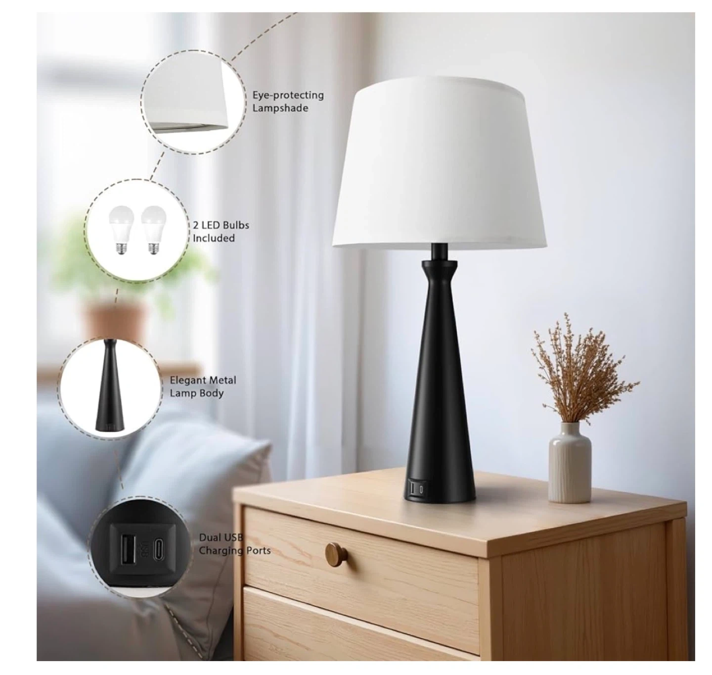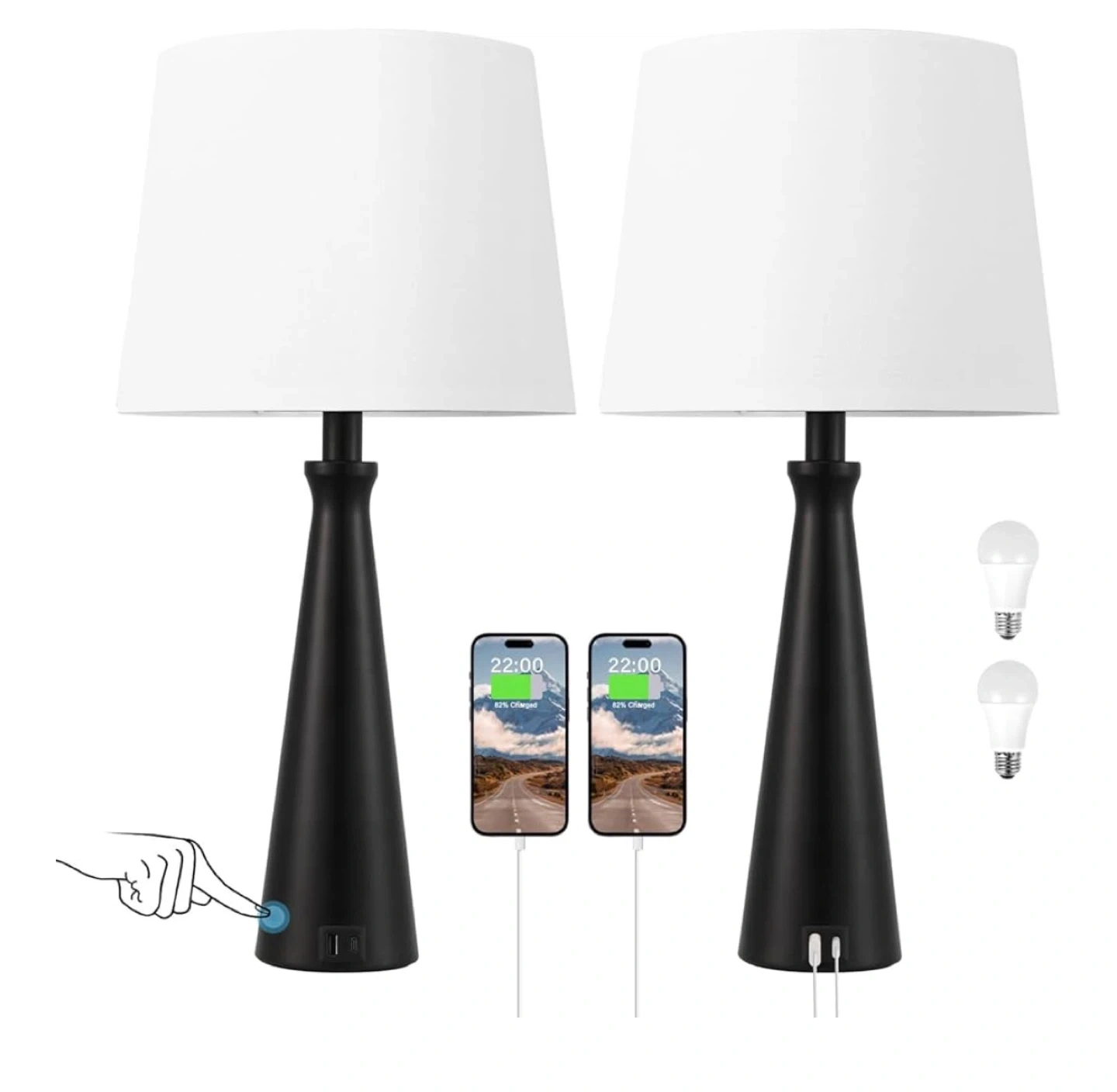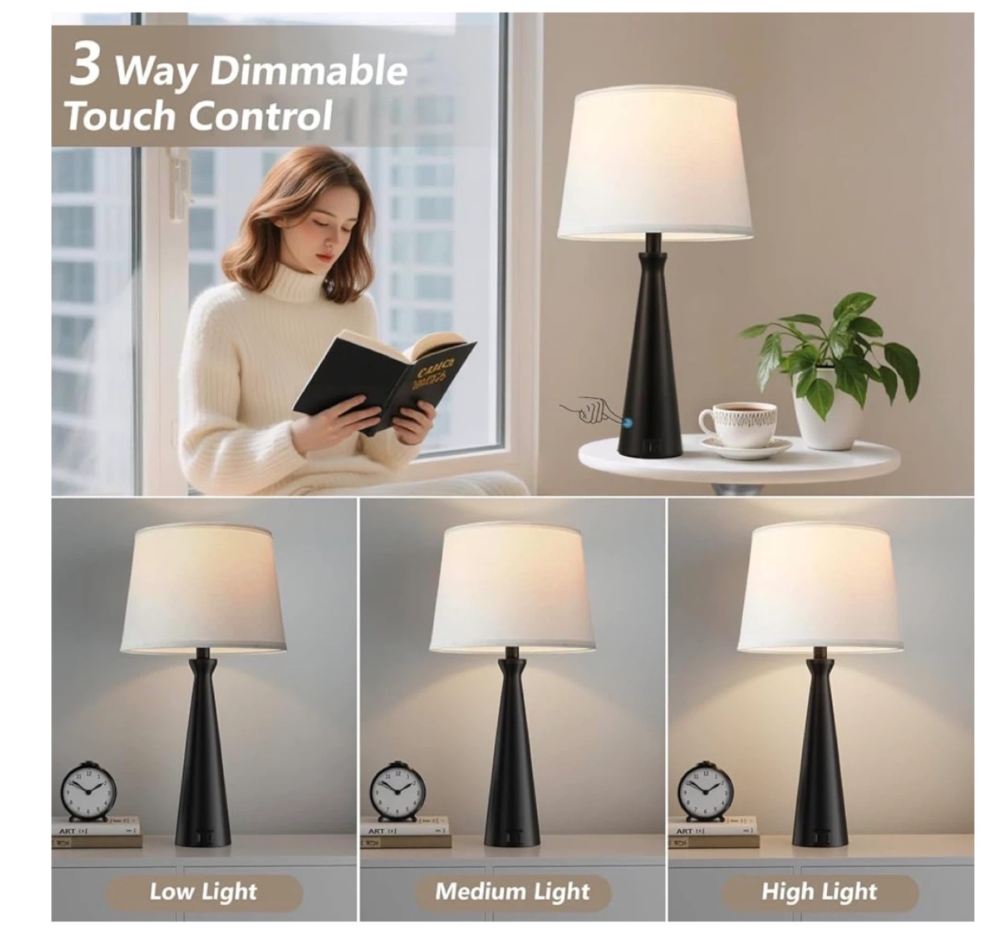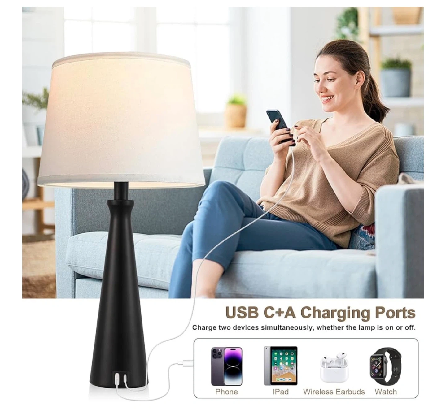 This is a dimmable touch control table lamp in black. It features 3-way dimmable touch control and USB C+A charging ports. It can charge two devices simultaneously, whether the lamp is on or off. Perfect for a bedroom, guest room, living room, or reception room