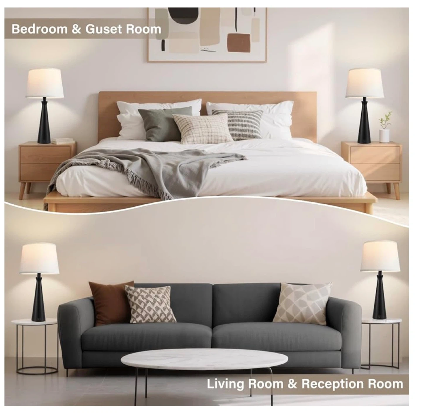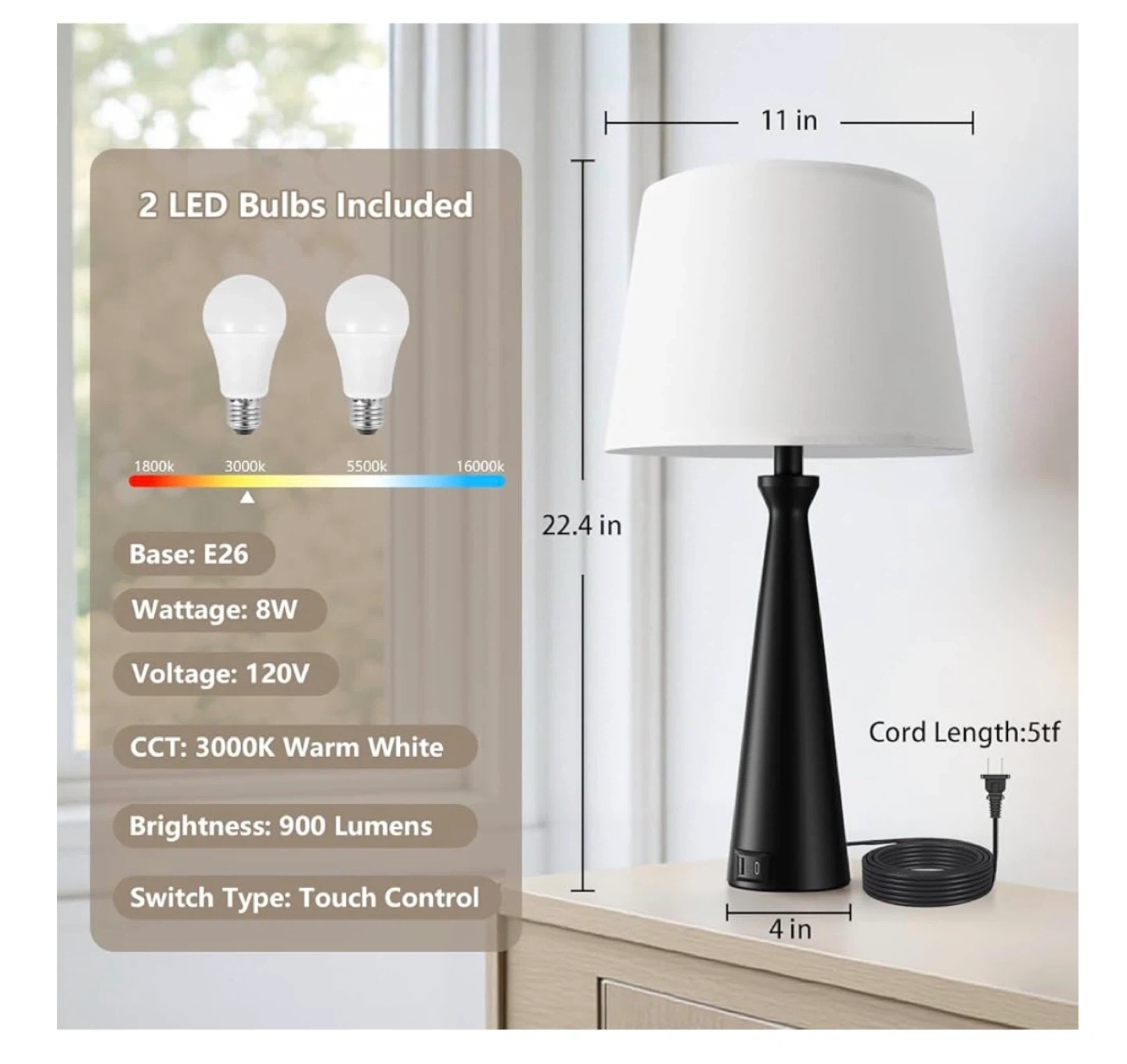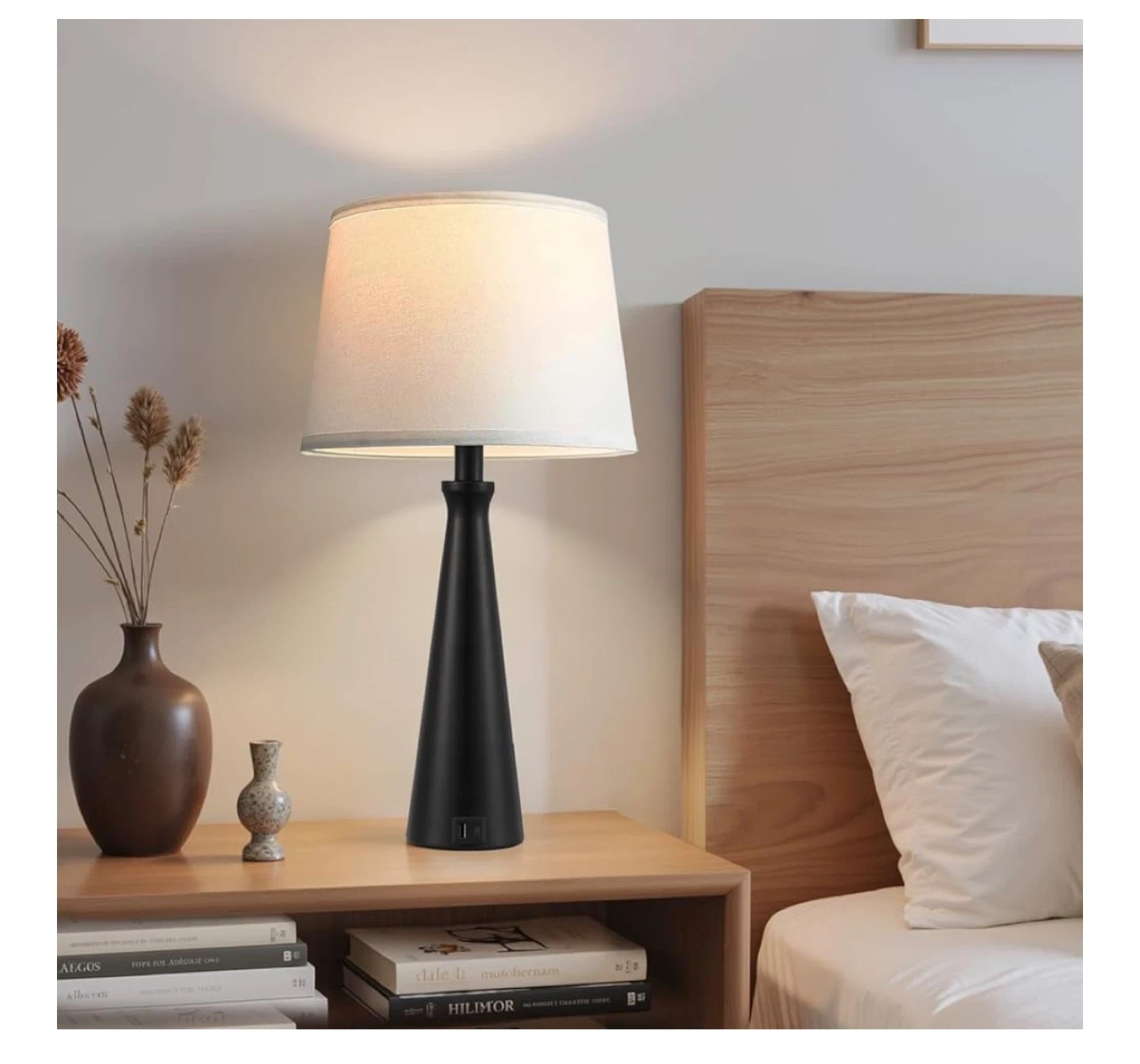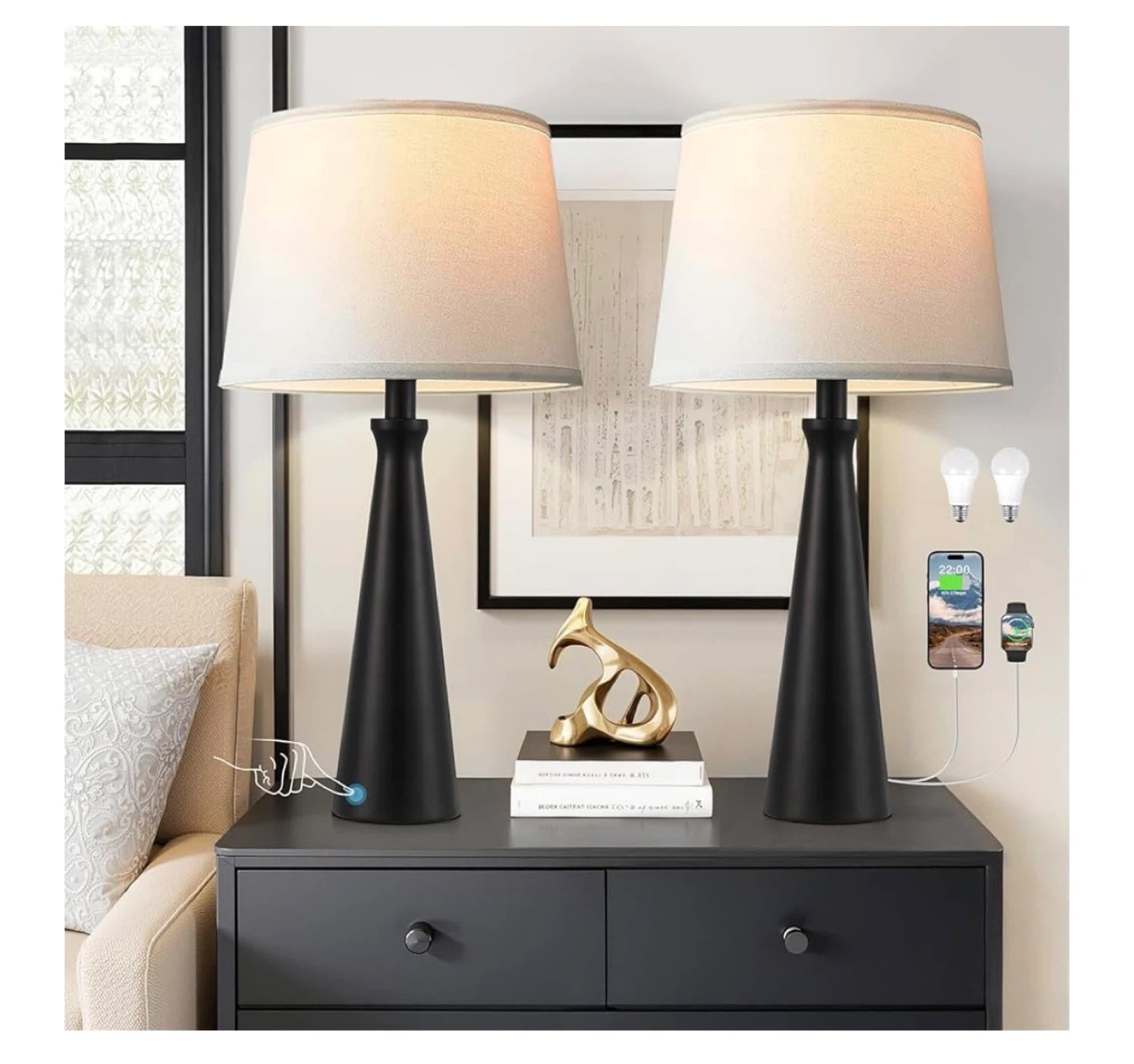 This is a dimmable touch control table lamp in black. It features 3-way dimmable touch control and USB C+A charging ports. It can charge two devices simultaneously, whether the lamp is on or off. Perfect for a bedroom, guest room, living room, or reception room