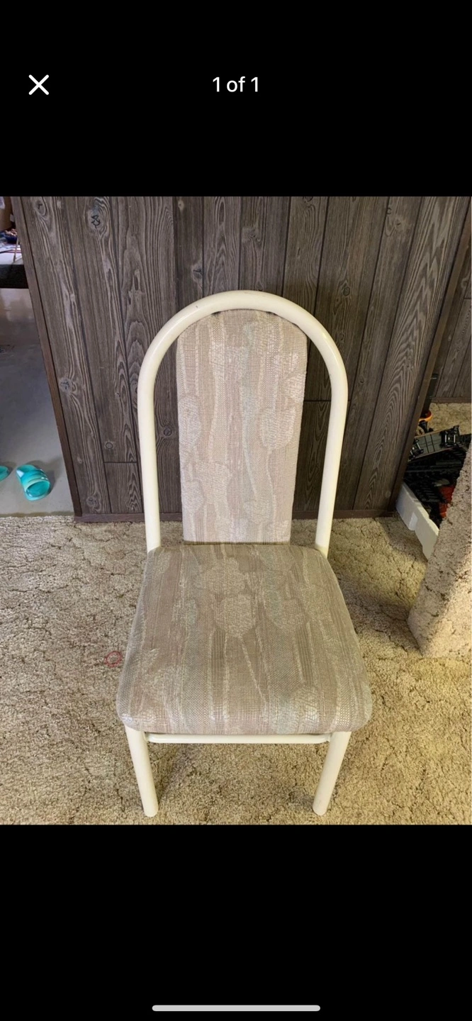 13Set of 3 dining chairs with patterned upholstery. Metal frame. $10 each