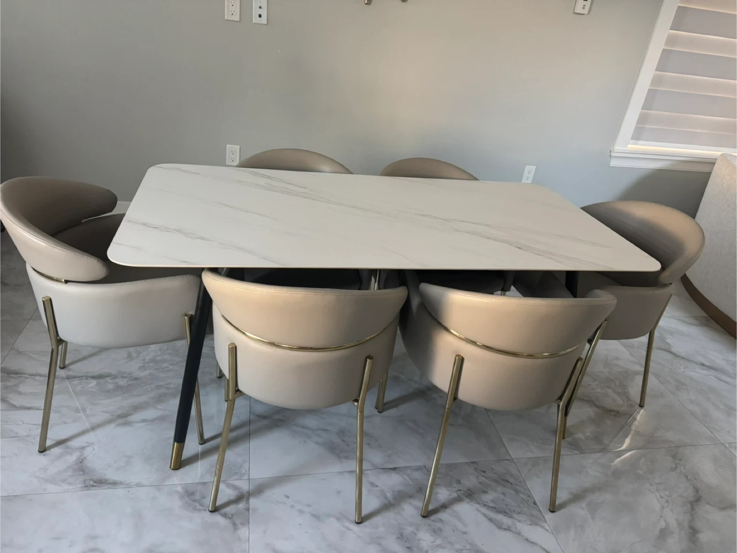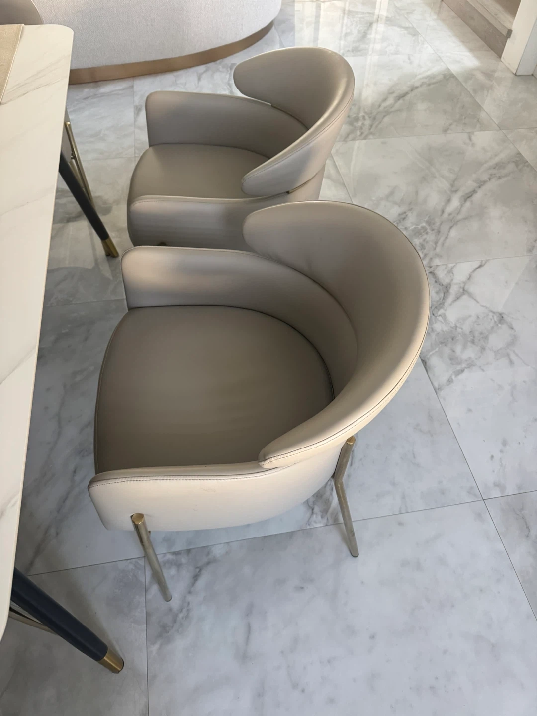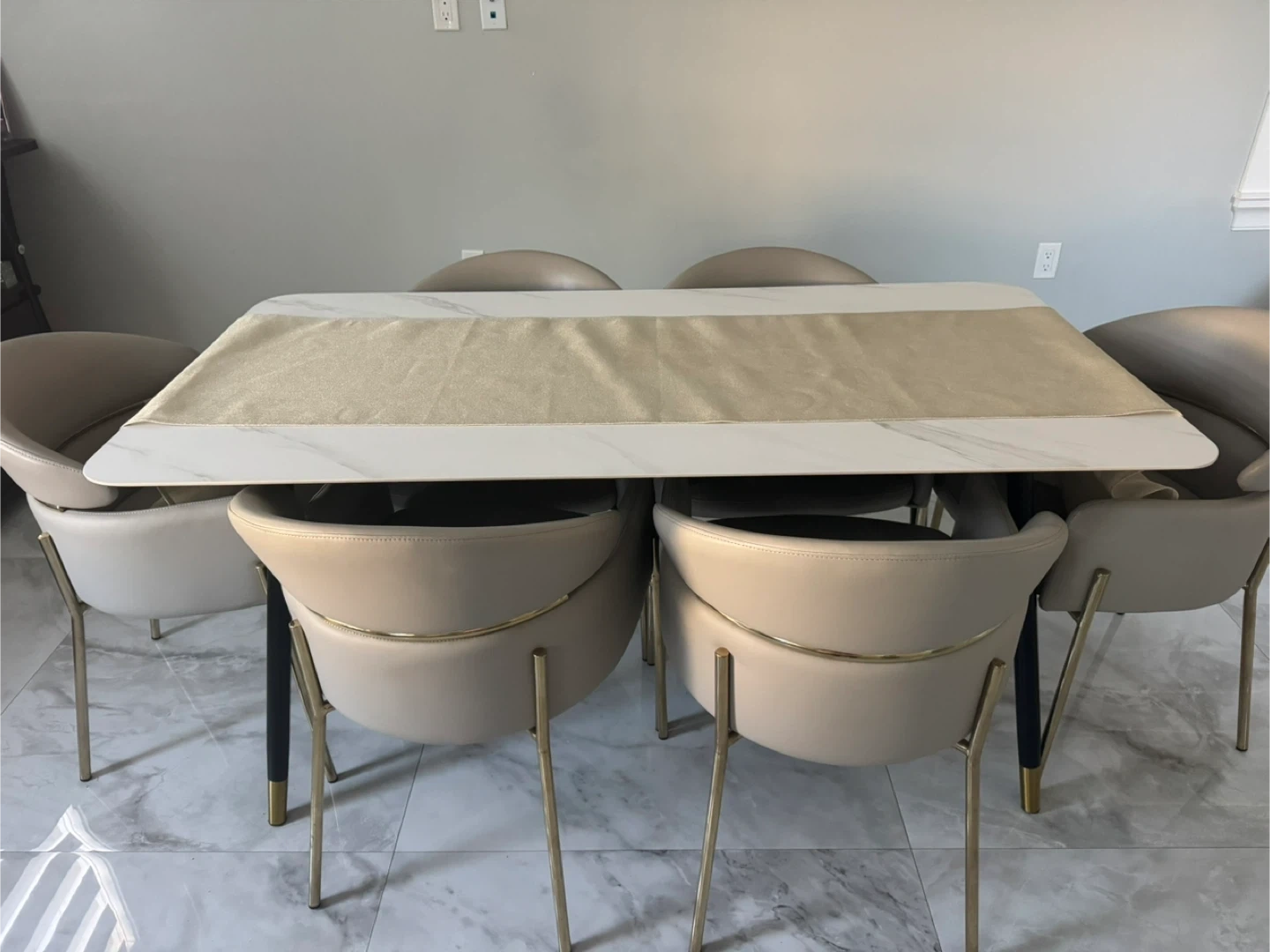 Selling a set of six dining chairs! They're in great shape and have a modern, curved design with beige upholstery. Perfect for adding a touch of elegance to your dining space. The table top is marble