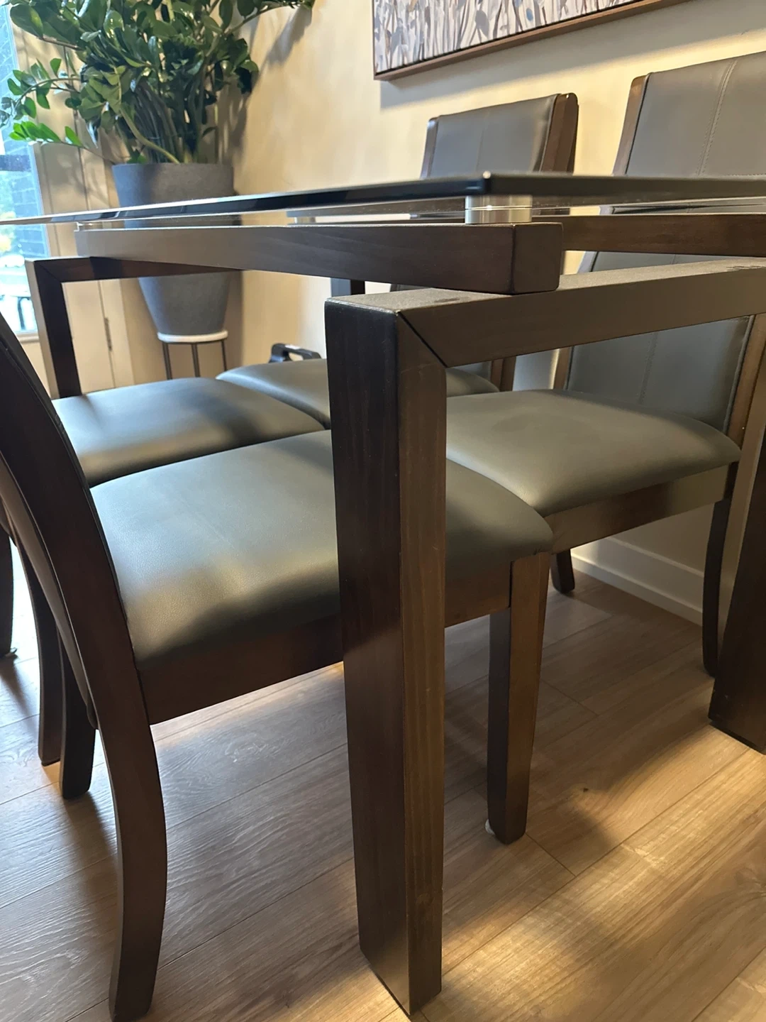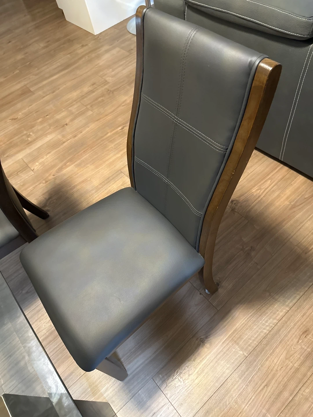 Selling a set of four dining chairs. They feature a grey leatherette seat and back, with a wooden frame. They're in great shape and would look great in any dining room!