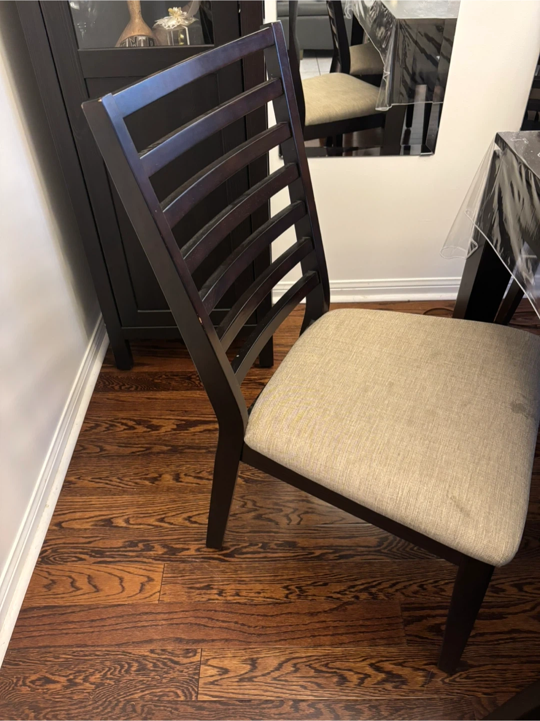 10Selling a set of six dining chairs. They have a dark wood frame and a neutral-coloured fabric seat. They're sturdy and in great condition, perfect for your dining room! Seats need to be cleaned but they are in amazing condition. $100 each